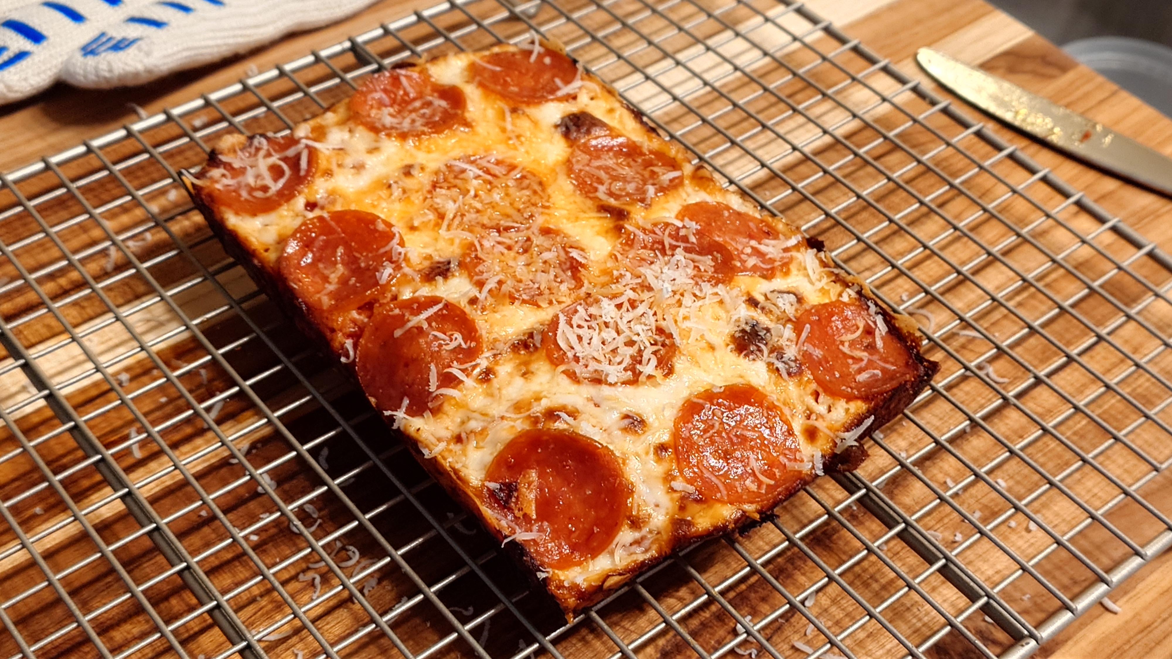 1. Place rack on the second lowest slot. 2. Set oven to 450 degrees. 3. Oil pan and place dough inside. Allow time to relax so that it will stretch properly. 4. Place in the oven and parbake for 6-7 minutes. 5. Take out and add toppings (sauce, cheese, & pepperoni in my case). 6. Cook for an additional 13 minutes or until the cheese has started to take on your preferred amount of browning. 7. Remove to a wire rack to cool for 5 minutes, then dig in!