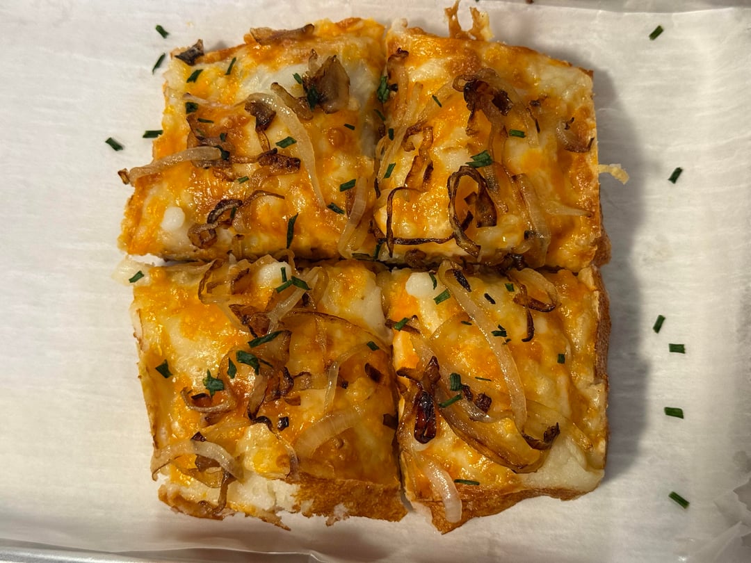 First Friday of lent Pagash time in USA(OH/PA at least). Mini pan fried topped with garlic mashed potatoes, cheese blend, grilled onions, and a little chives.