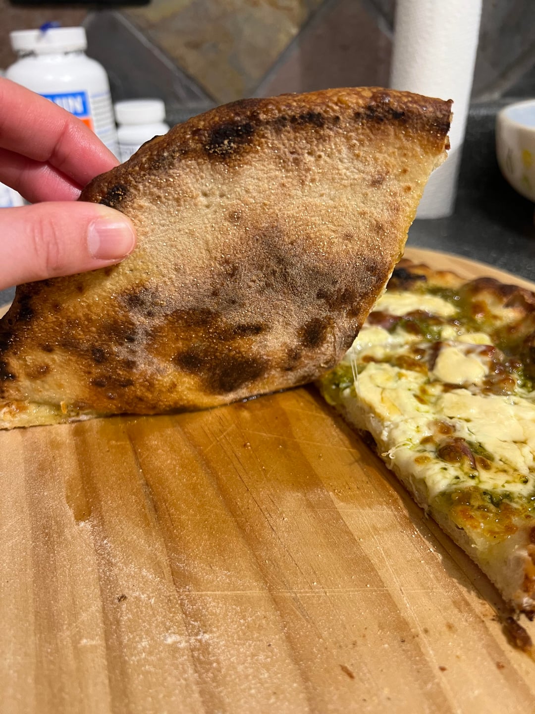 Did a garlic/olive oil base with parm, mozzarella, and ricotta. Had some pesto and Proscuitto to use up so drizzled a little bit of the pesto and added the prosciutto under the cheese so it would get crispy but wouldn’t bur. Came out great, will be definitely be making again!