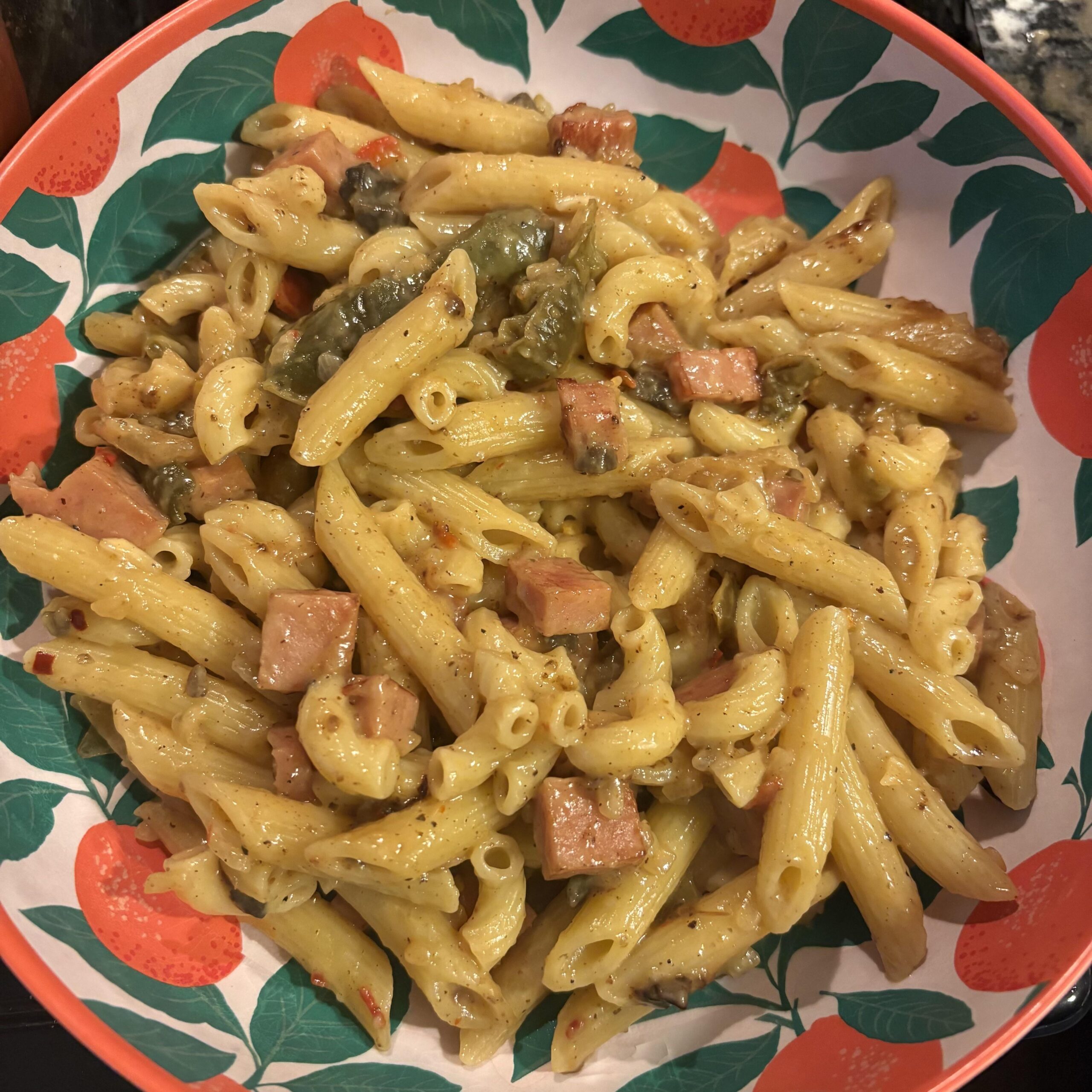 – Low sodium SPAM, choice of pasta, bellpeppers, onions, Special Shit seasoning, red pepper, red garlic, and low sodium cream of mushroom.