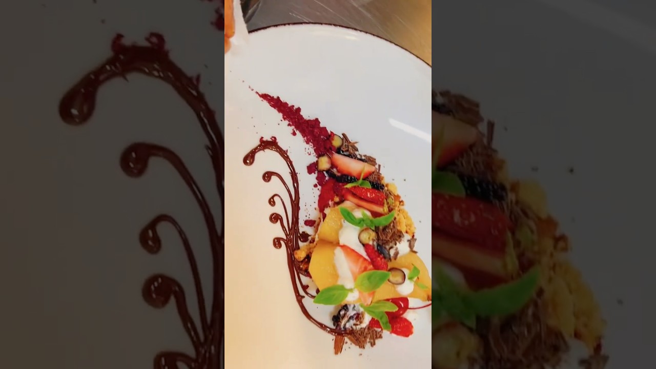 With strawberries and berries, dark chocolate, ricotta topped with chocolate chips on an almond crammbel, berry powder, and basil