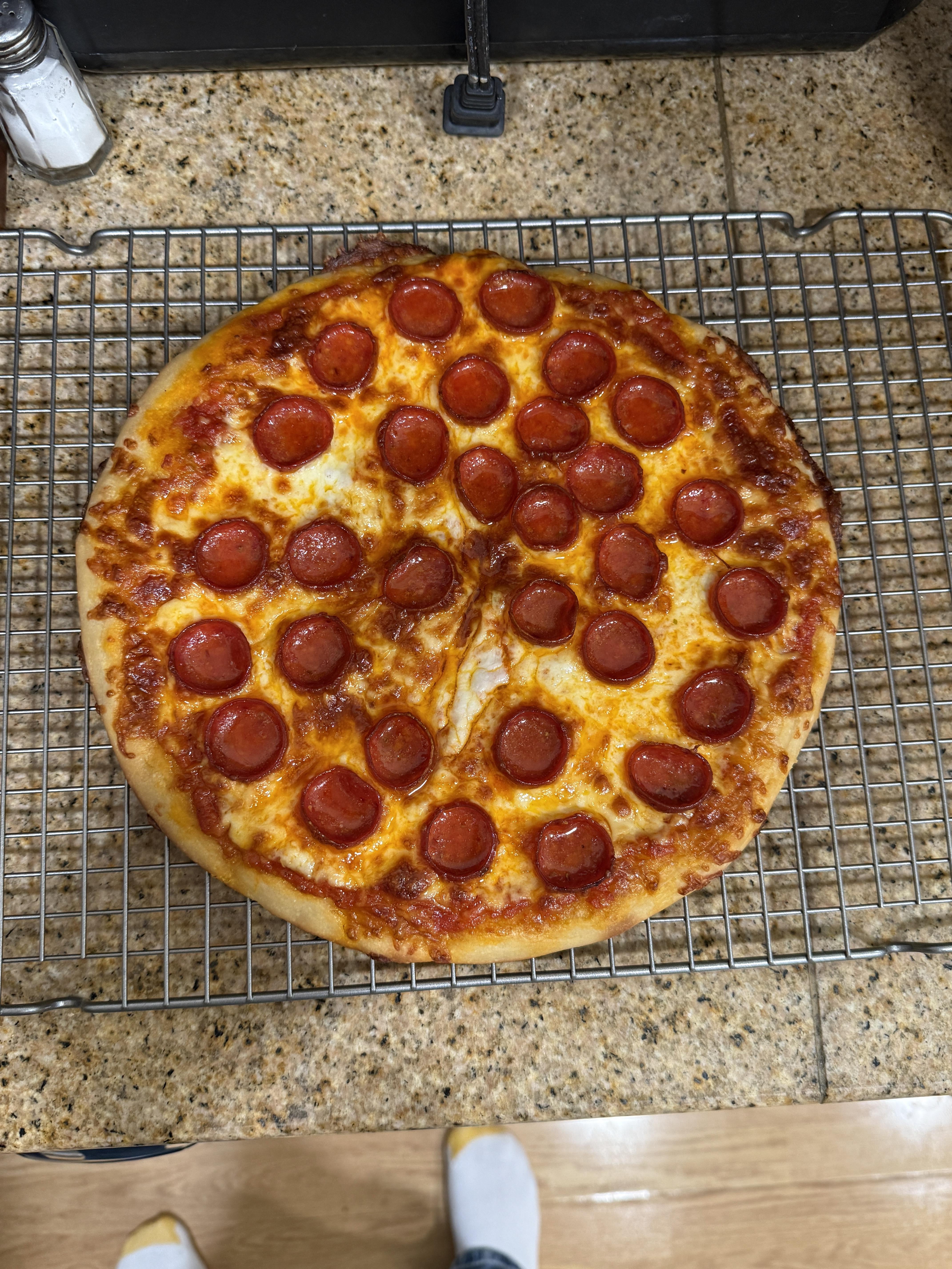 It was kind of a sorta promising start/ slight disappointment. Iron skillet. Store bought Trader Joe’s dough; Rao’s Pizza Sauce; 2 kinds of mozzarella; Hormel cups. / we used too much dough— and the center of the dough was not entirely cooked. Regular oven, 475°, 18 minutes in oven and 3 more on stovetop. NOT A lot of flavor.