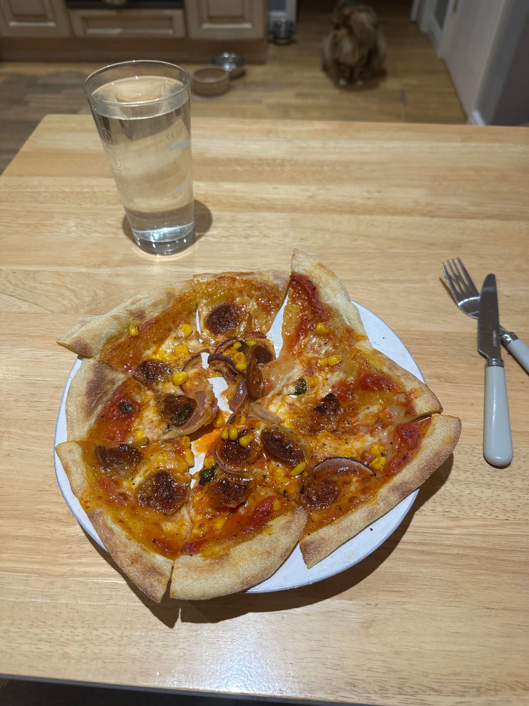 I split the dough into two equal doughballs at 5:30pm (approx 280g), and then left it on a floured plate covered with clingfilm until approx 8:45pm, when we then made the pizzas.
