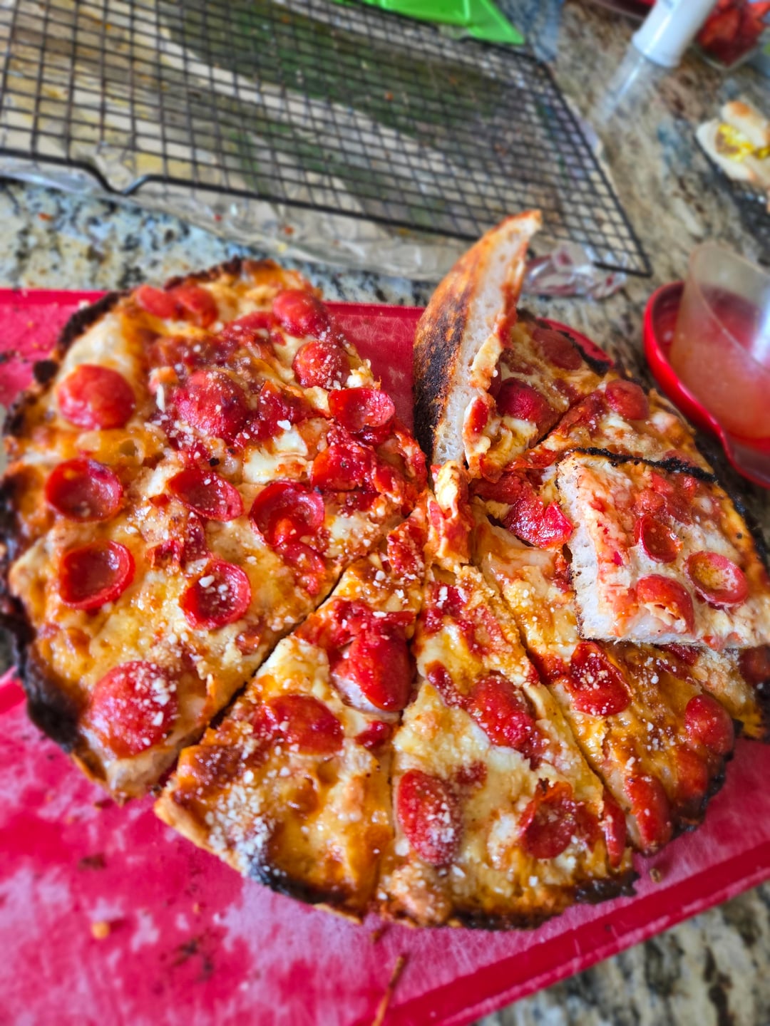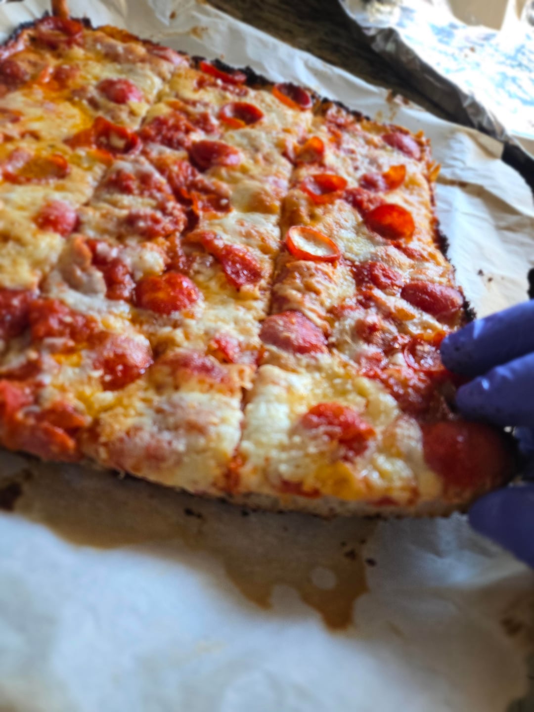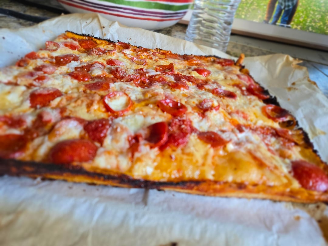 until bake time. I light up the stove to preheat while I top the rest, first with picante soppresata to evenly cover, then with square thin slices of whole milk mozzarella, then I do 3 stripes of sauce (been working on using less sauce on the top, how many Oz do you recommend?). Lastly I have chopped up fresh mozzarella (squeezed/ patted dry on paper towel or parchement) that I scatter about the top, finished with quarter sized thin cut pepperoni, which cup up into lil greasy bowls of goodness.