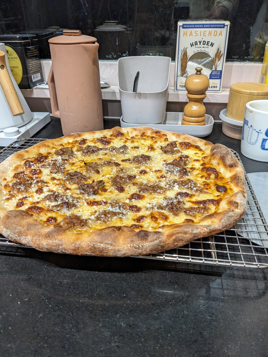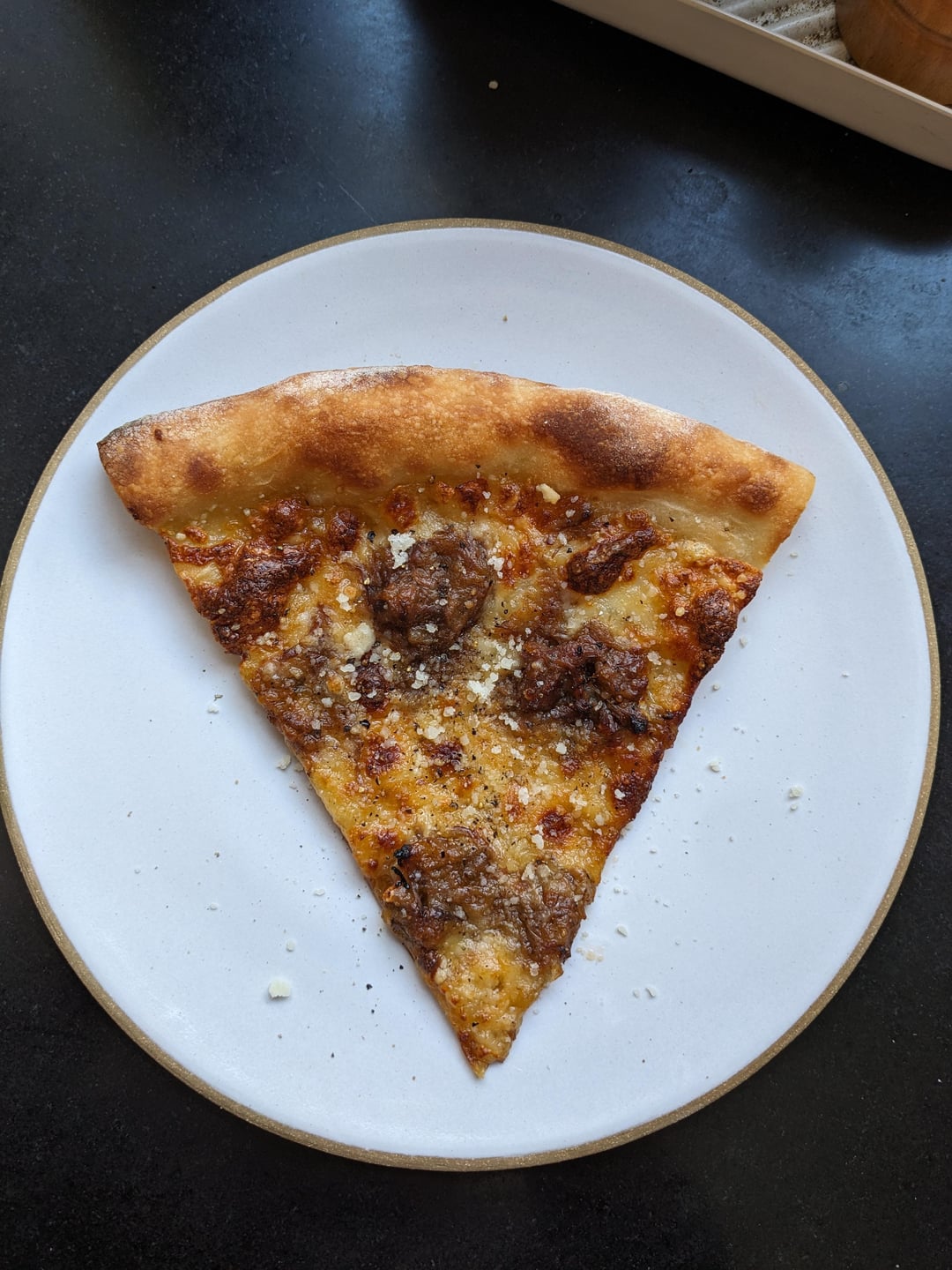 Using a leftover pasta Genovese (beef slow braised in a ton of onions, a touch of tomato, and not much else) on a sourdough pie with slices of Muenster, shredded low moisture mozz, gruyere, olive oil, and finished with black pepper and pecorino.