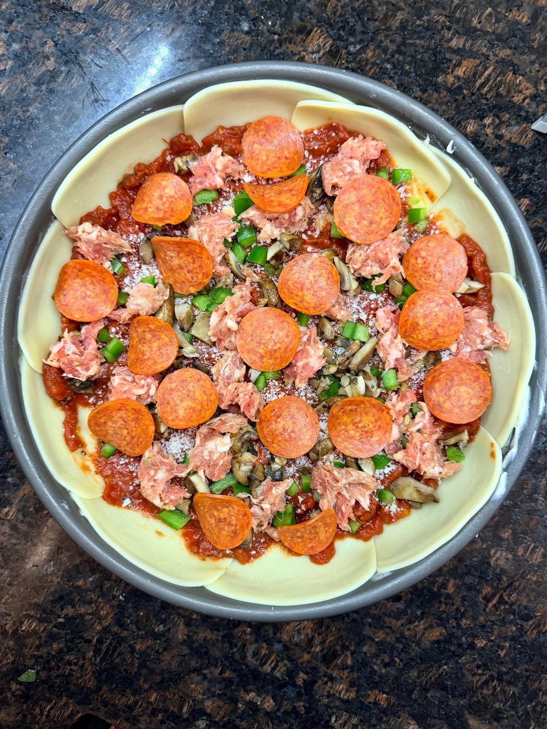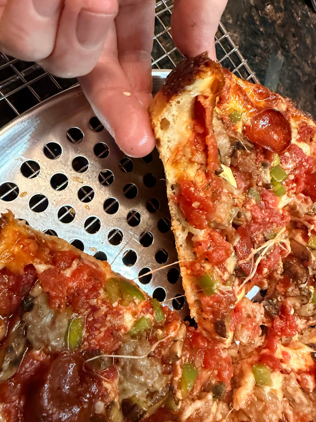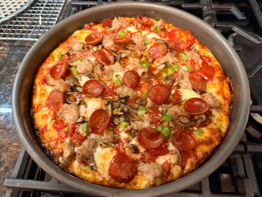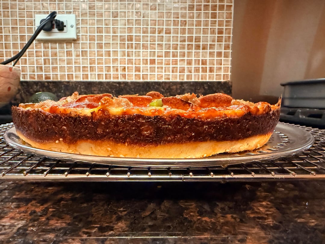 I felt pretty good about this one! I've been making Chicago pan pizzas for the past year and a half. I haven't kept track but I'm somewhere around 20. I feel like I've made a lot of good progress and this one had almost everything going for it. I think the amount of toppings weighed it down in the middle a bit so it didn't rise as much as I'd like it to have, but that's about the only thing I was unhappy about.