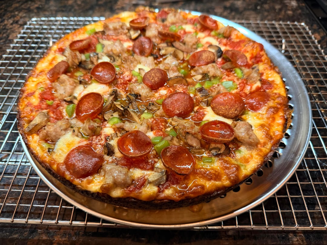 Not a big fan of supreme pizzas, but it looks good! Nice job!