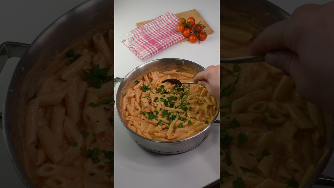 Add the cooked pasta directly into the sauce, then stir in the grated Parmesan. Mix everything well and sprinkle with freshly chopped parsley.