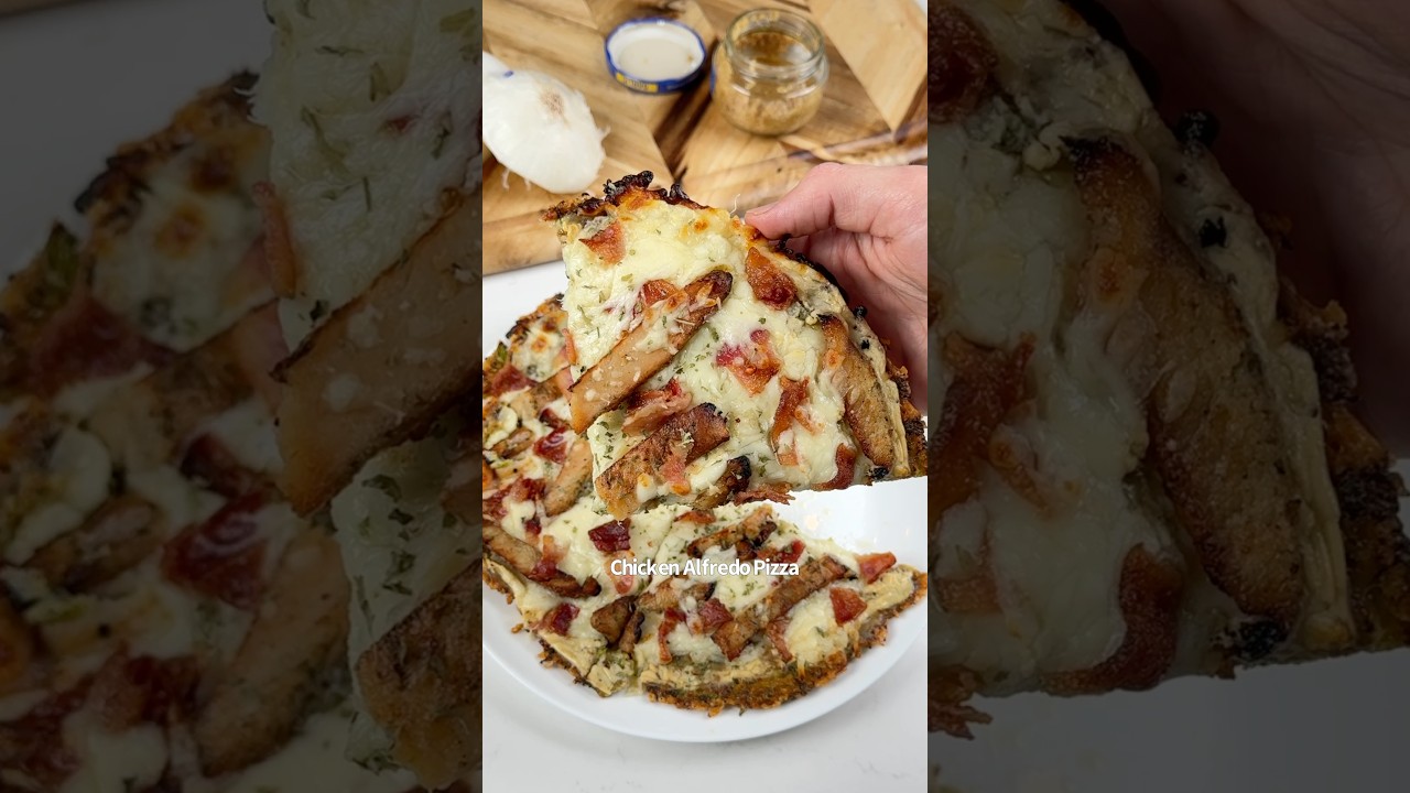 Toppings: 1/4 cup Alfredo sauce 1/2 cup shredded mozzarella 1/4 cup cooked chicken 2 tbsp cooked bacon, chopped