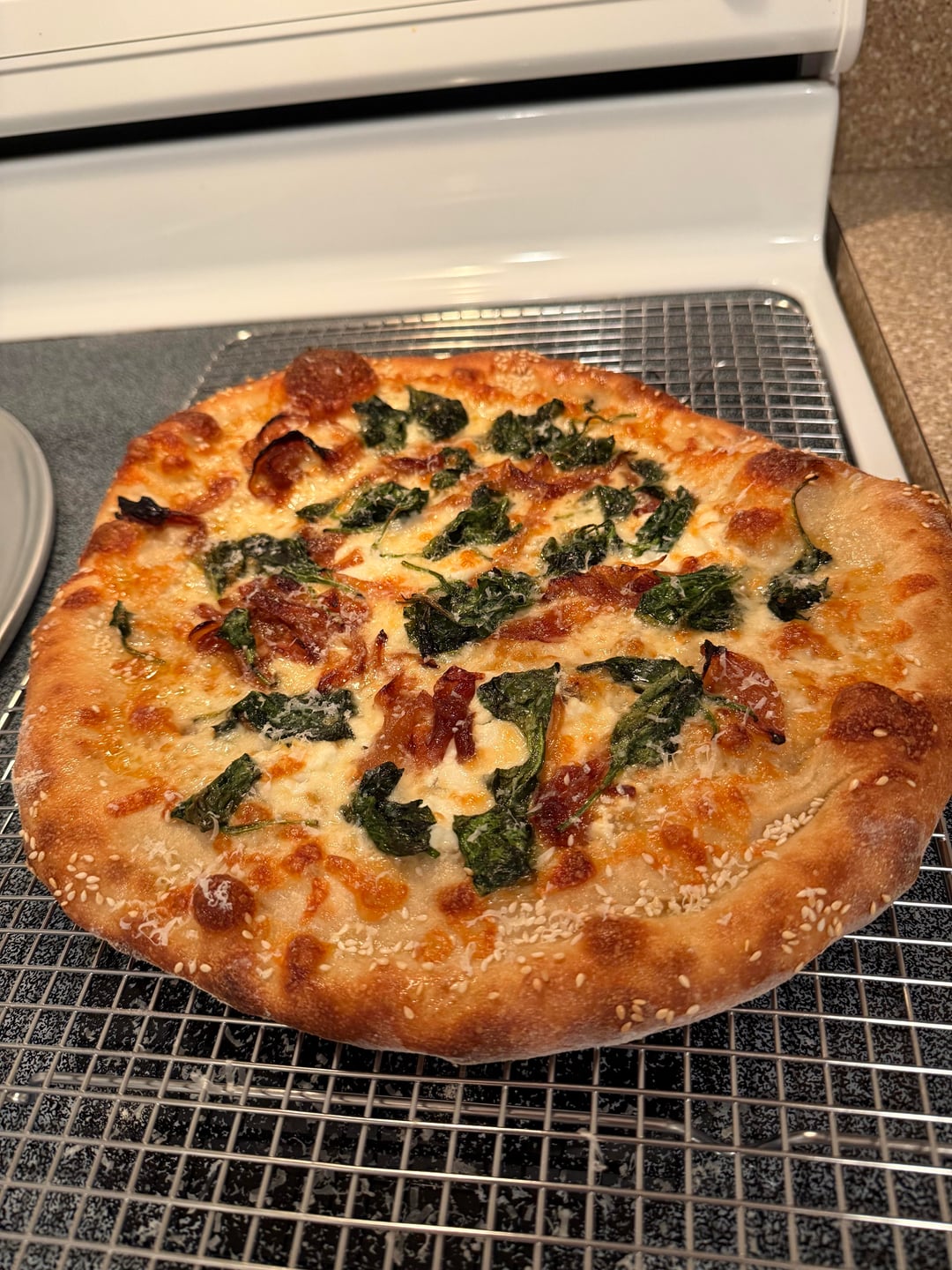 Upside down pizza and a white pizza with spinach and carmelized minions