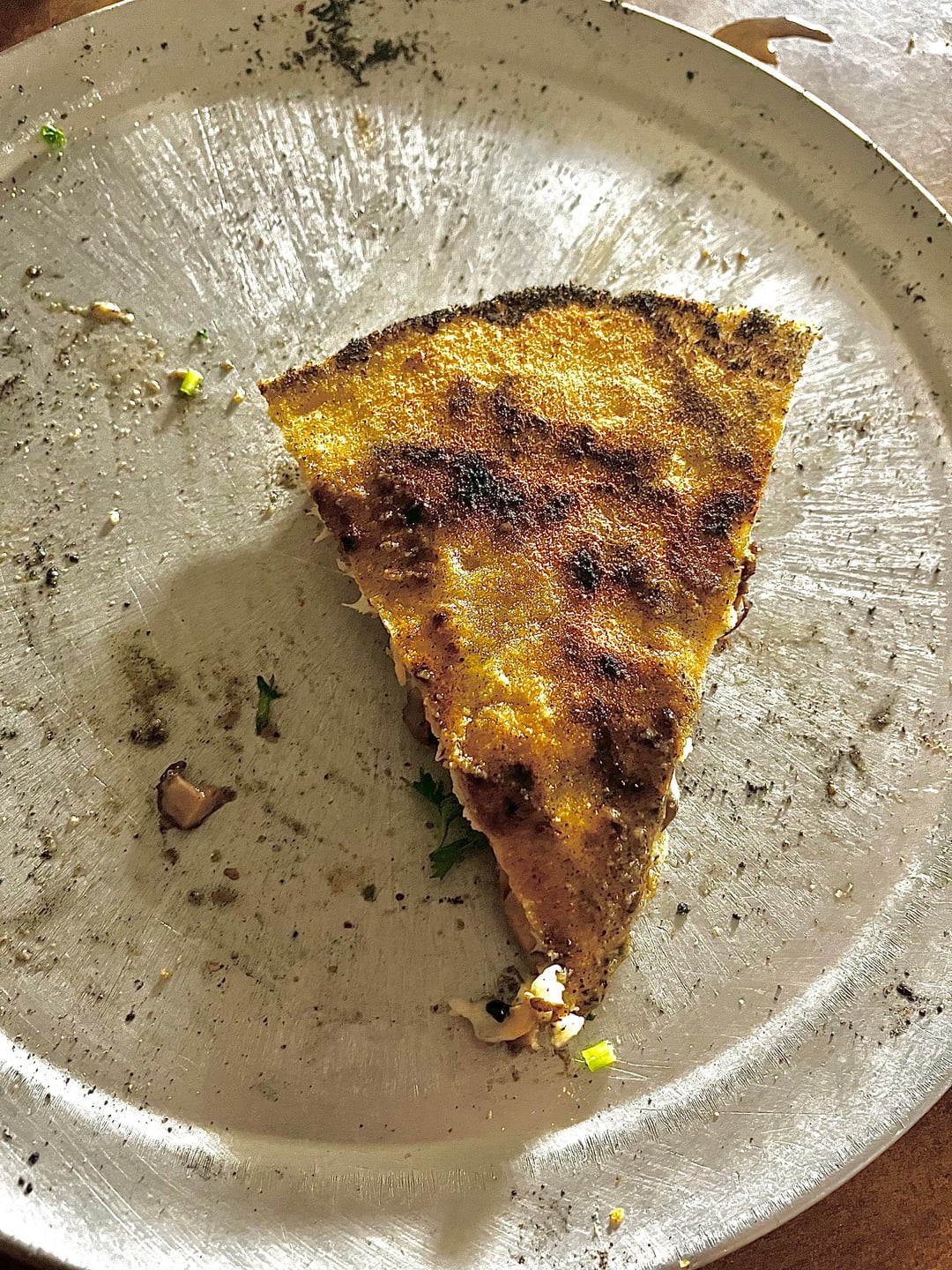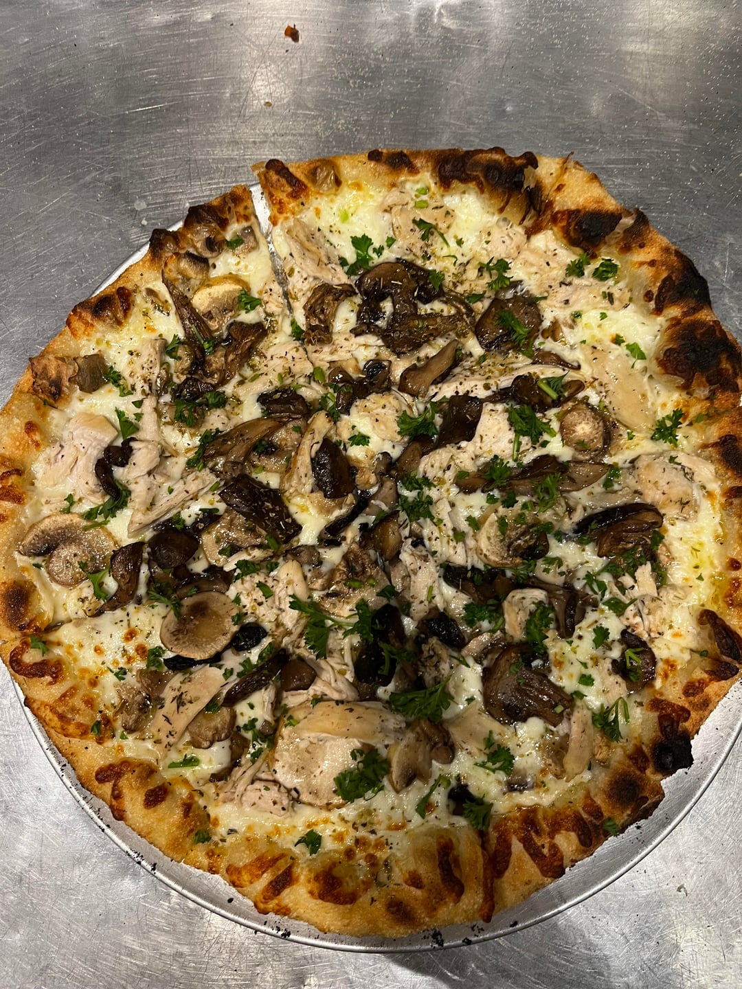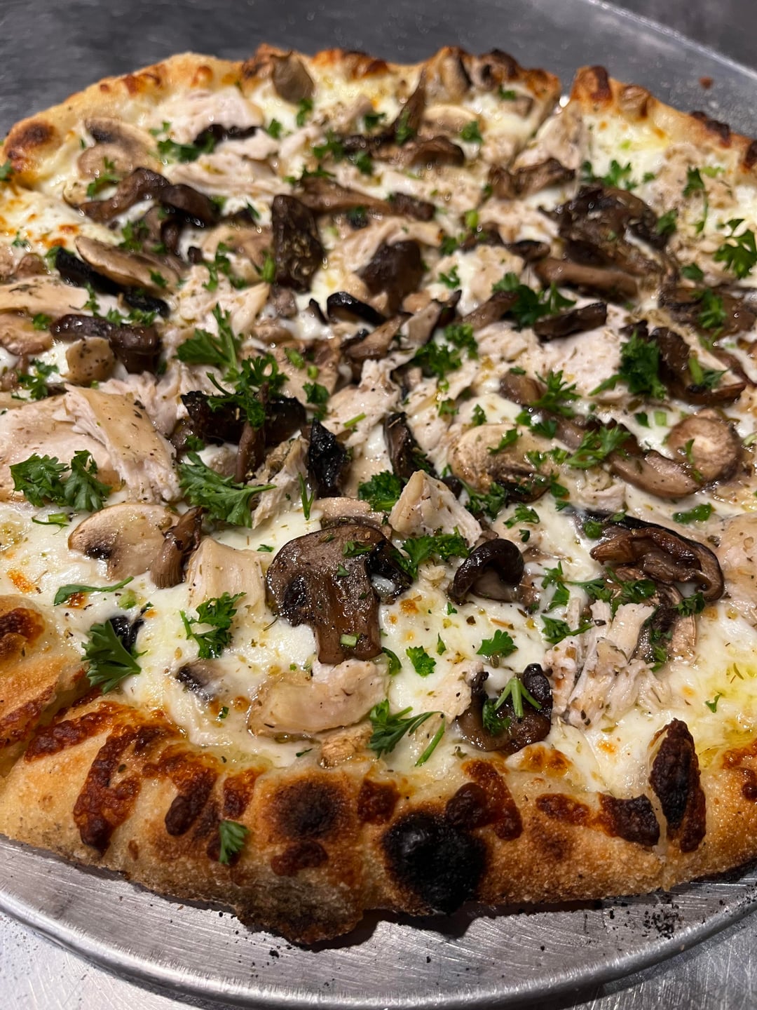 Commercial brick oven pizza oven from Italy (gas). Dough is made from scratch, hand tossed. This one is sauce-less, I brushed an extra virgin olive oil, oregano, black pepper mixture in the crust. Then topped with shredded moz, shredded basil, 24hr brined chicken, portabella mushrooms, a 3-mushroom blend, roasted garlic, topped with chopped parsley. It was light and actually really tasty.