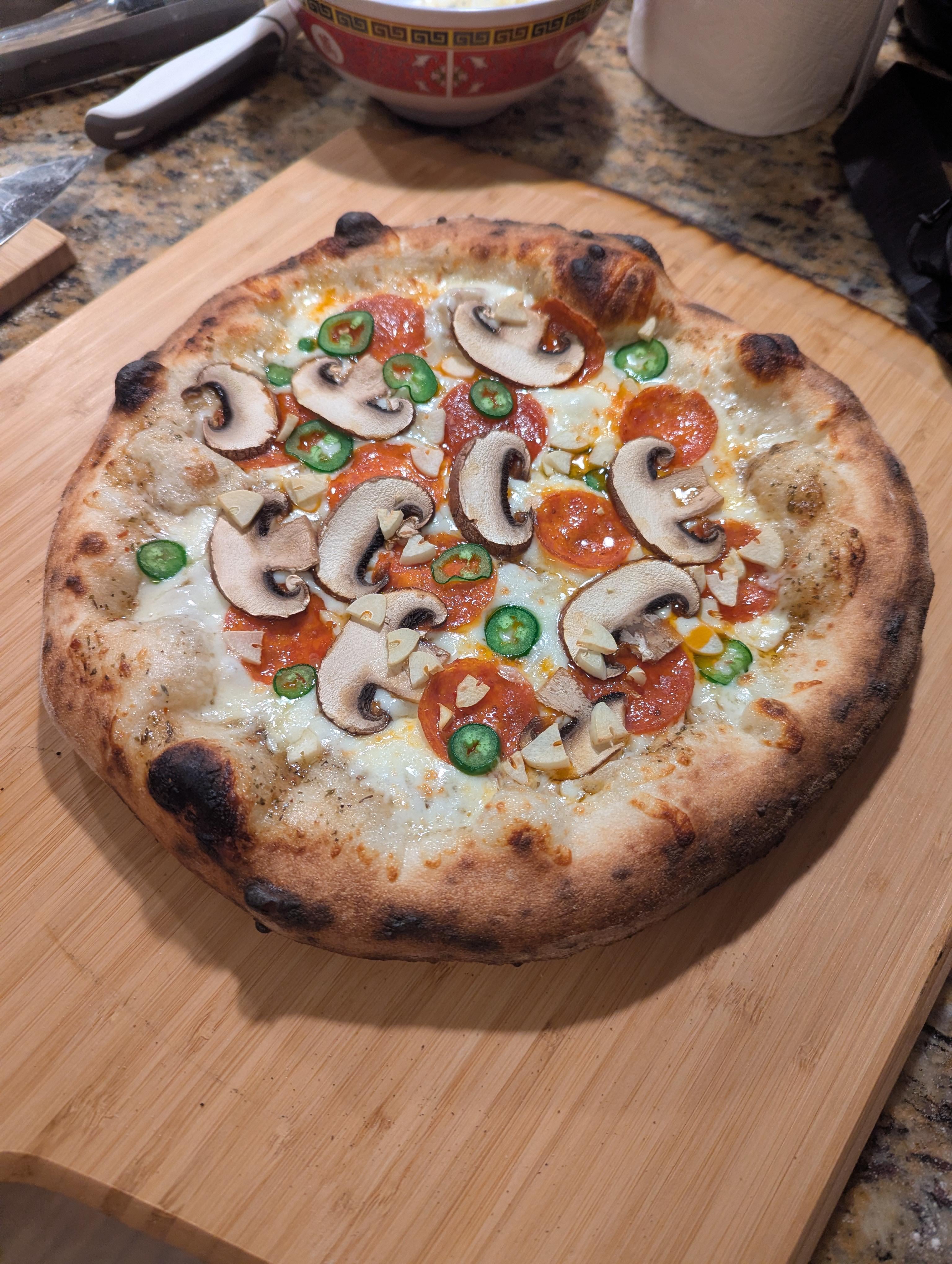 Pepperoni, mushroom, jalapeno, and garlic on a garlic parmesan base with LMWM mozz. Dough was a 24hr proof at 60% hydration, fired in the Ooni Koda 16. by r0botdevil outdoor ovenpizza 1 Comment Vast_Serve_7538 1 hour ago Looks yum! Unsolicited idea: I sauté mushrooms before I put them on as toppings so they’re real nice and cooked when the pizza is done.Write A CommentYou must be logged in to post a comment.