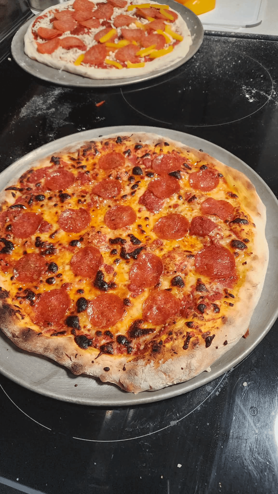 It was a little funny shaped and I didn't have a pizza steel so I added a extra three minutes in my oven and the pizza dough was cooked through! No char on the bottom but still tasted good 🙂 I bet if I had a pizza steel it would have had a crispy bottom, might invest into one soon. Over all happy for the first ever attempt!