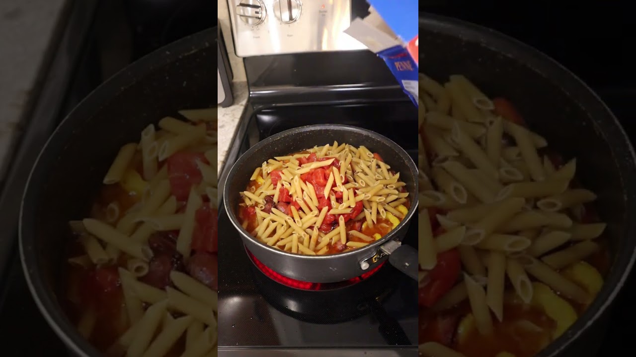 Slice and sauté the sausage and set aside. Cook mushrooms, bell peppers, and onions, when softened add garlic and cook until fragrant. Add meat back in along with chicken broth, tomatoes, and pasta. boil. Reduce the heat, cover, and simmer for 12 minutes, stirring occasionally. When the pasta is cooked, stir in cream cheese and top with grated cheese.