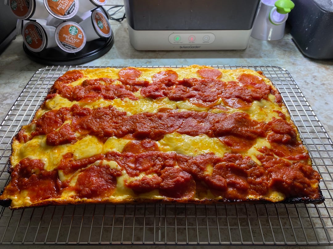 Here's the complete recipe for a classic pepperoni Detroit-style pan pizza made in a Lloyd Pans pan (or similar rectangular pan), with the dough adjusted for making it now and proofing overnight in the fridge for deeper flavor. Everything is done by hand in a bowl—no mixer required. It serves 4-6 people. You'll make and initially rise the dough today (about 2-3 hours active time), then proof it overnight in the fridge before using it tomorrow.