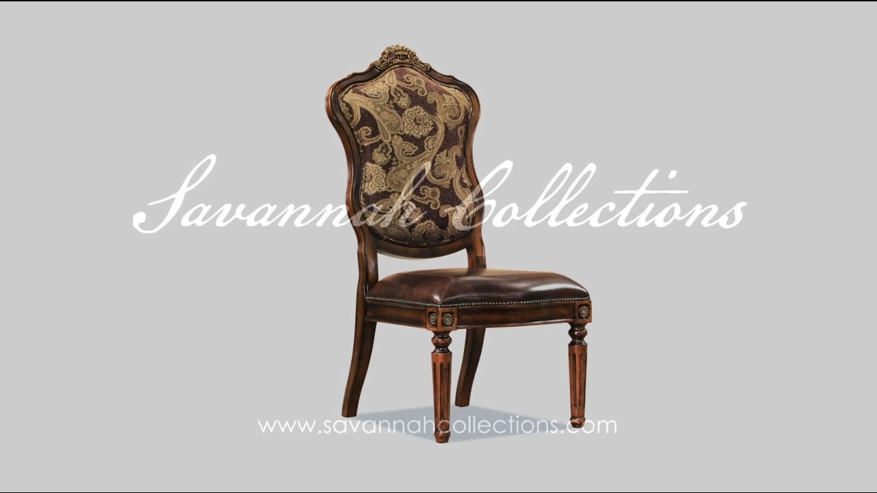 Georgia Dining Arm Chair in Antique Chestnut finish. Chair features Italian leather seating, high-grade European fabric and is meticulously constructed from solid mahogany wood with gold accent and brass nailhead trim. One of our most popular dining sets.