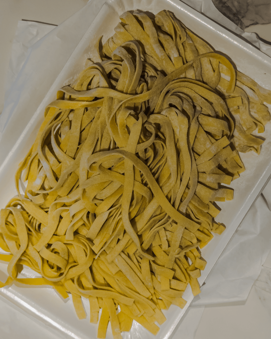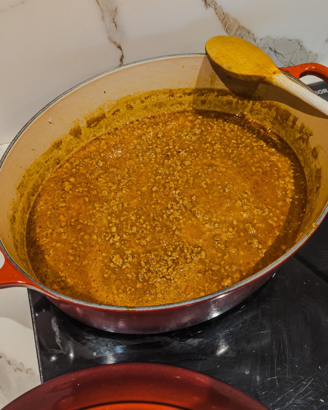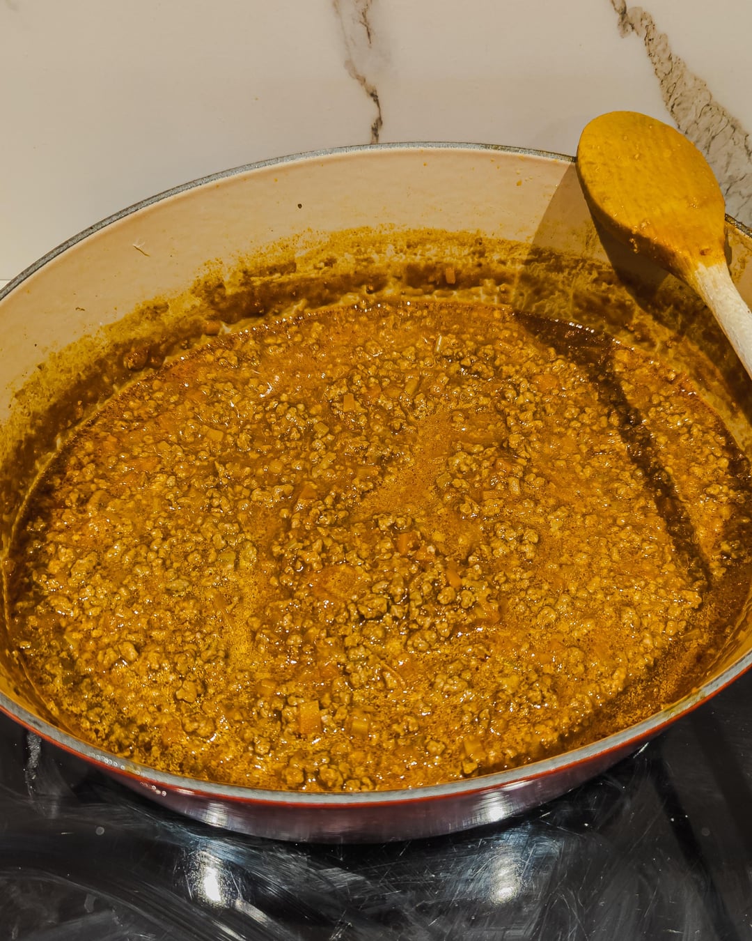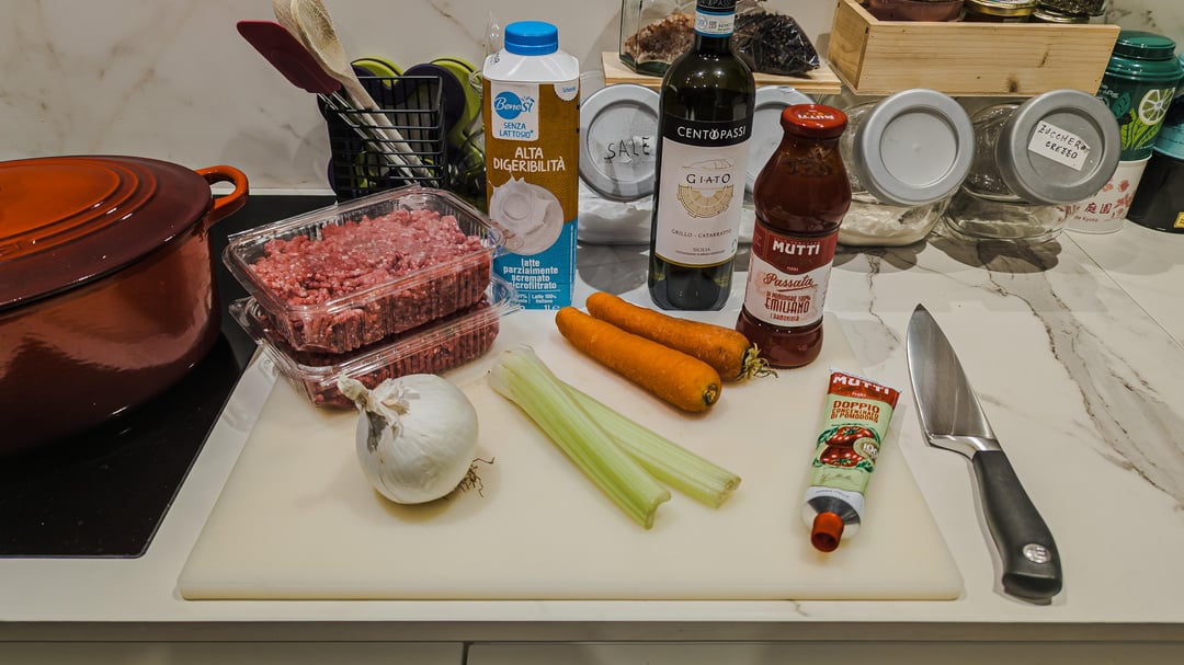 I followed the recipe by the Bologna Chamber of Commerce, the only difference is that the butcher didn't have fresh pancetta and I replaced it with minced pork meat (the butcher minced both beef and pork together). Overall the ragù cooked for 4 hours (+ soffritto).