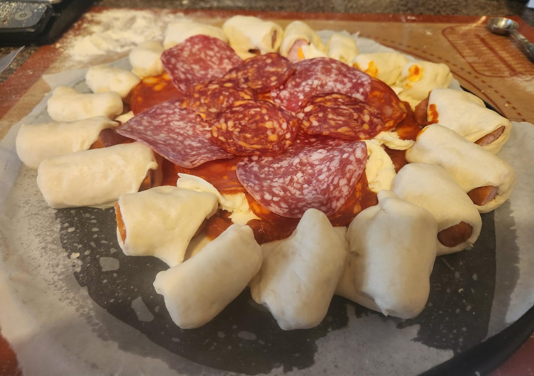 In the spirit of these glorious days, I made my own take on the hot dog crust pizza. I topped it with salami, Spanish style chorizo, and pepperoni. It came out pretty decent. I alternated between hot dog and cheese crust. The string cheese I used did not stay put. I should have also gone with a bit more sauce. The crust would also have been improved with a garlic butter brushing.