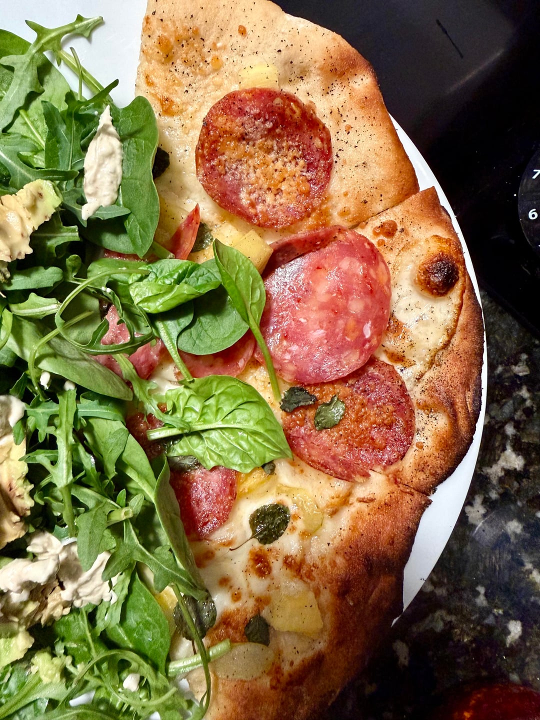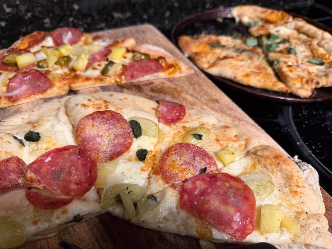 Homemade wood-fired green grape, pineapple, salami over mozzarella, pecorino, and evoo with a sprinkle of fresh mint leaves pizza. Yes, mint. Saw something similar finished with fresh prosciutto post-cook, so used uncured salami pre-Ooni and then added some post-cook, too. Gang…this was boss fight level flavor. Get in mah belleh!