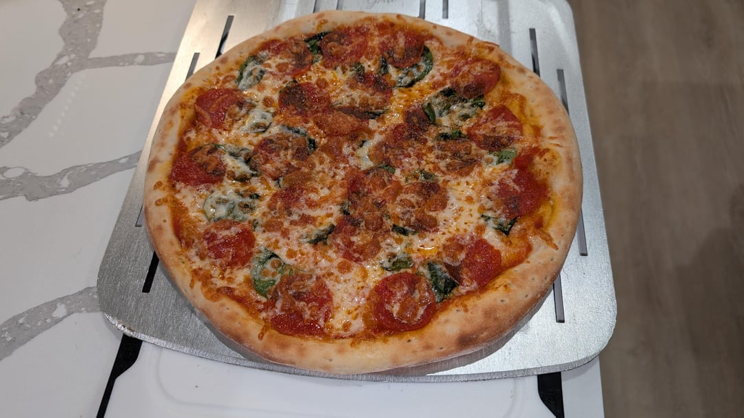 Cooked with the Gourmia indoor pizza oven, thin crust setting (525 top heat, 575 bottom heat). Time adjusted to 7 minutes. Turned convection on for the last minute.