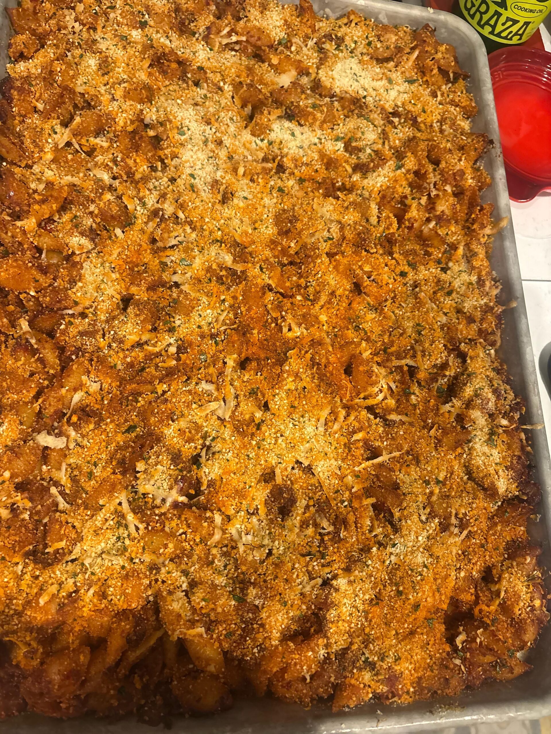 I have been making this pasta for a few years now-it is the recreation of the off menu Hernan pasta at Horses restaurant in LA. There is no official recipe online. It has Nduja sausage, diced onion, minced garlic, vodka, tomato paste, salt, black pepper, heavy cream, butter, Calabrian chili peppers in oil. I cook the noodles while the sauce is simmering and after the noodles are cooked I add them to the sauce and put them on a sheet pan-then adding seasoned breadcrumbs and freshly shaved Parmesan