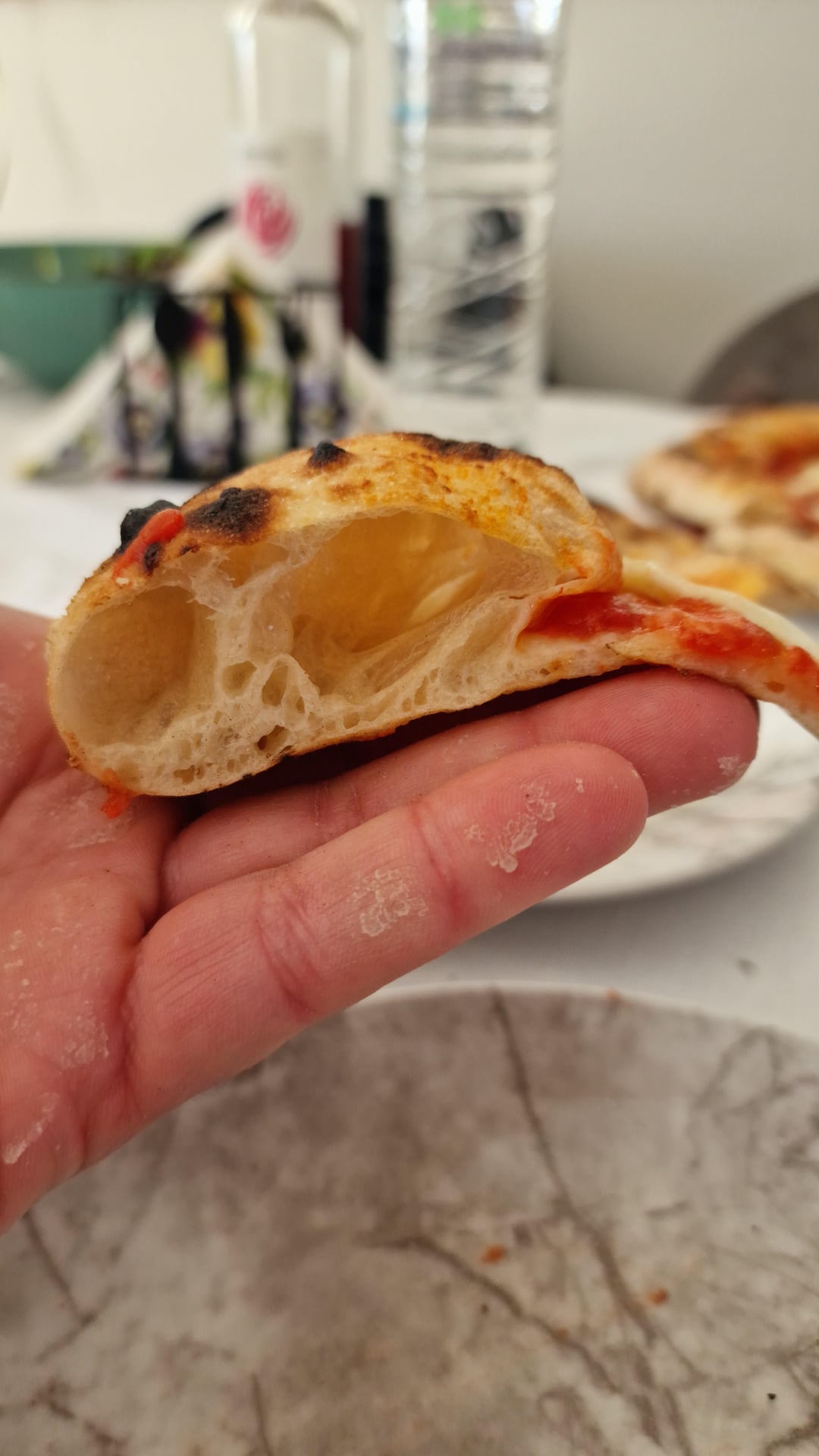 knead by hand till smooth, rest on bench with some olive oil covered with a bowl. 3x folds every 30 minutes. divide, make balls and rest for 2-3 hours depending on room temperature and bake em.