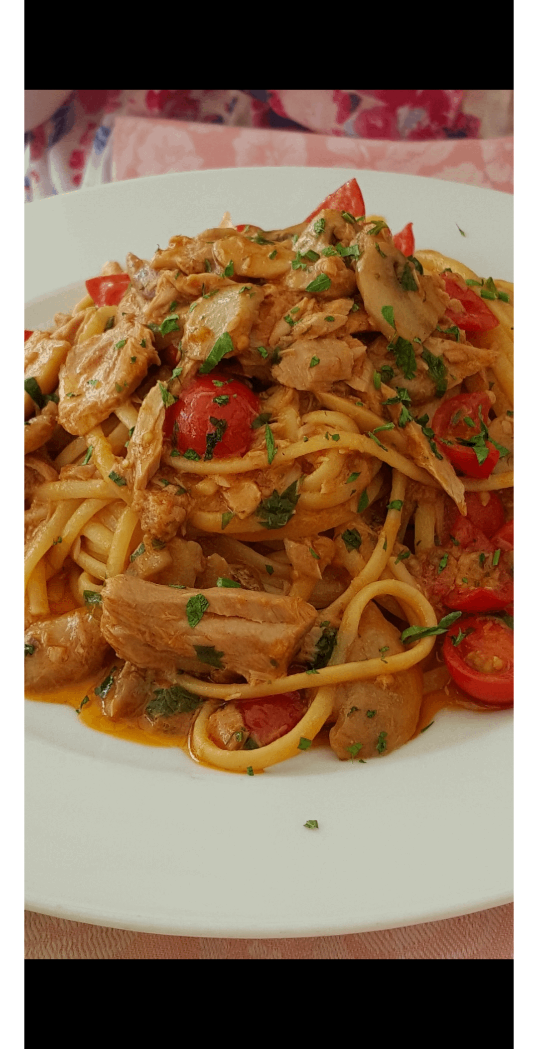 Spaghetti with cherry tomatoes and tuna.