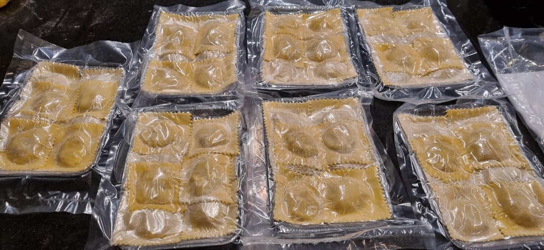 I have recently started a small fresh pasta business and sell frozen fresh pasta and sauces in my town, all handmade by me. The reactions have been overwhelmingly good and I sell them faster than I can make them. How do these ravioli look? Around 15g filling and 10g dough in each one, 205g total per portion (plus 105g sauce).