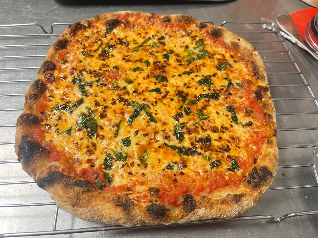 68% hydration. Used my kitchenaid for the first time instead of just stretching and folding. Worked great but the dough was pretty sticky and I almost ruined it taking it out of the bowl. Tomato sauce made with frozen tomatoes from my garden. Trader Joe’s whole milk mozz. Gonna add some part skim next time to hopefully improve browning of the cheese. Cooked at 700 top and 700 bottom temps in my Gourmia oven. A little floppy in the middle, but only because I stretched it until it was almost translucent and loaded her down with cheese and sauce. Super crispy and chewy crust. One of my favorite pizzas I’ve made