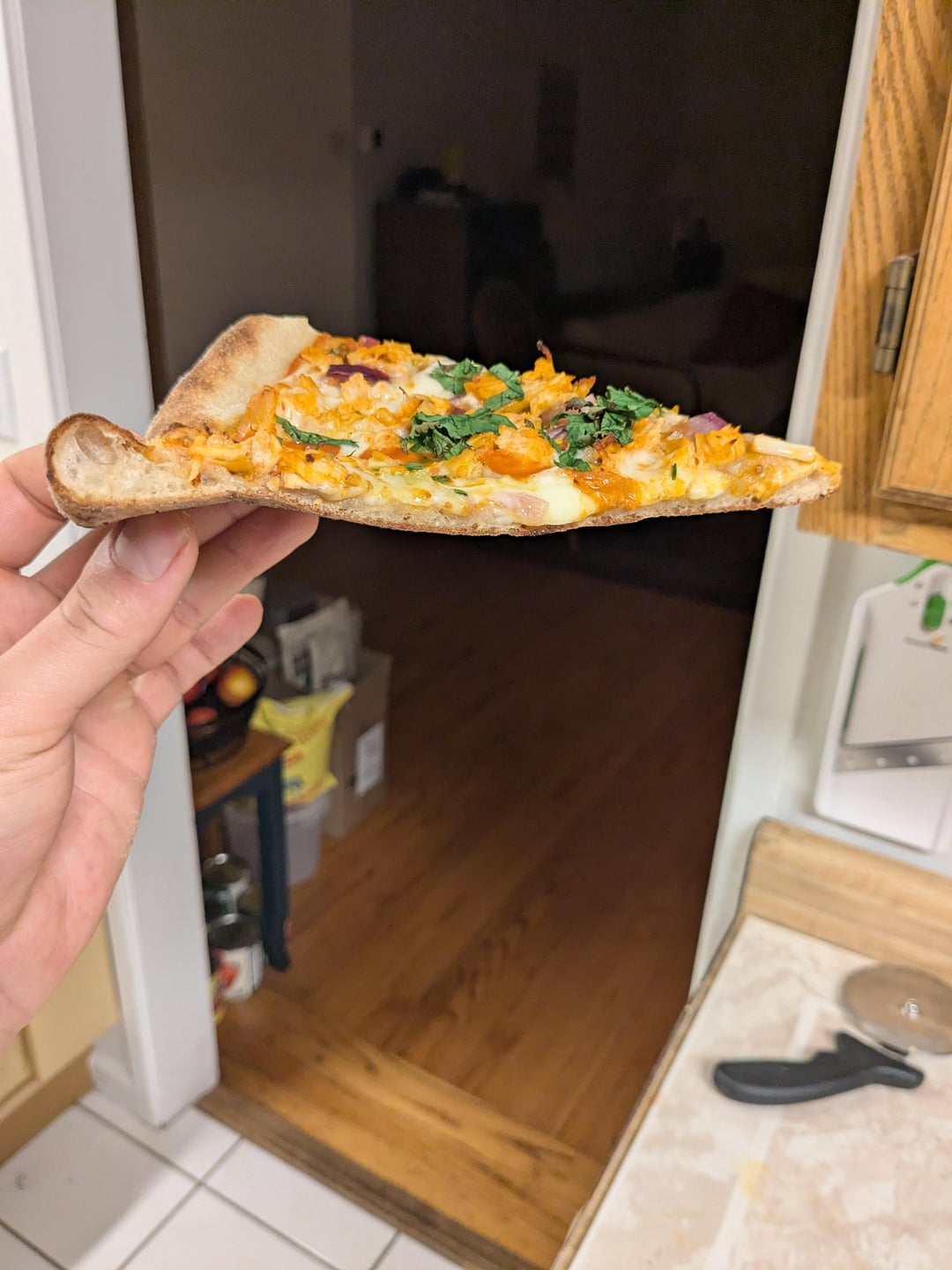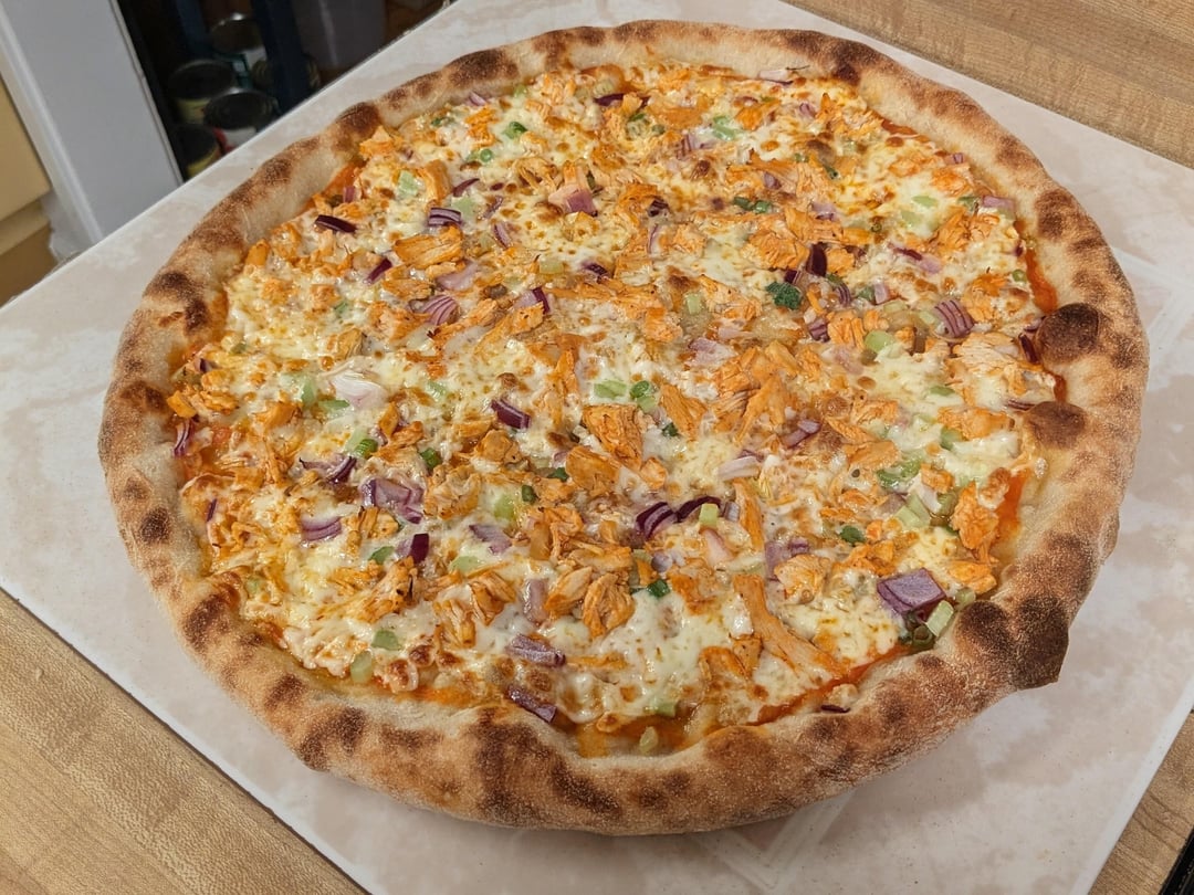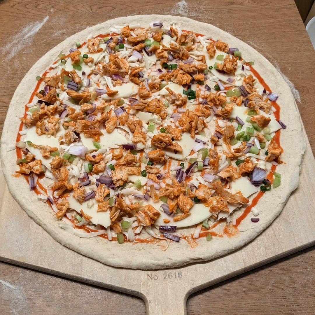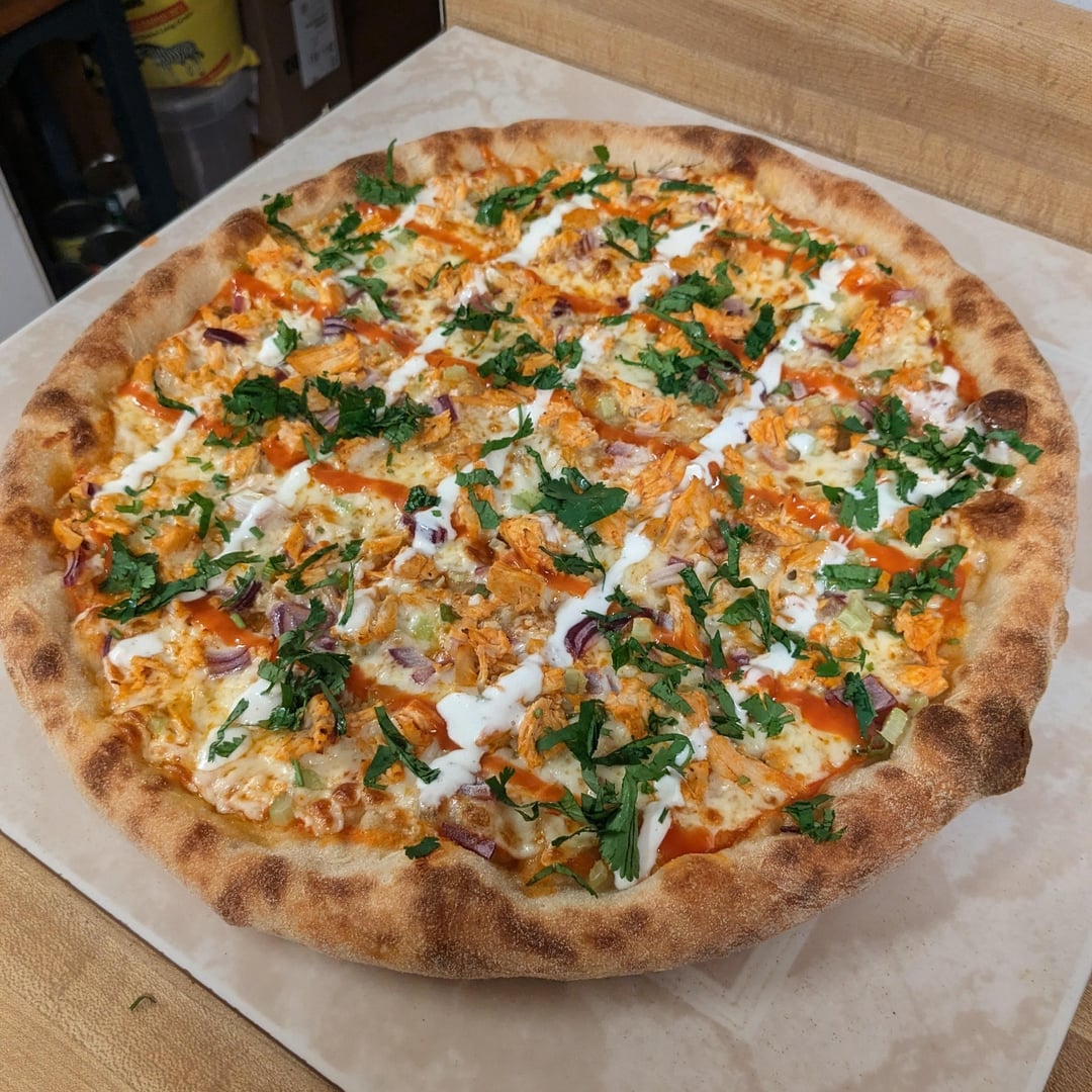 -Toppings: Frank's Red Hot/Extra Virgin Olive oil base, 50/50 Mozzarella/provolone, diced red onion, green onion, celery, buffalo coated chicken breast, cilantro, and some stripes of Frank's Red Hot and blue cheese dressing