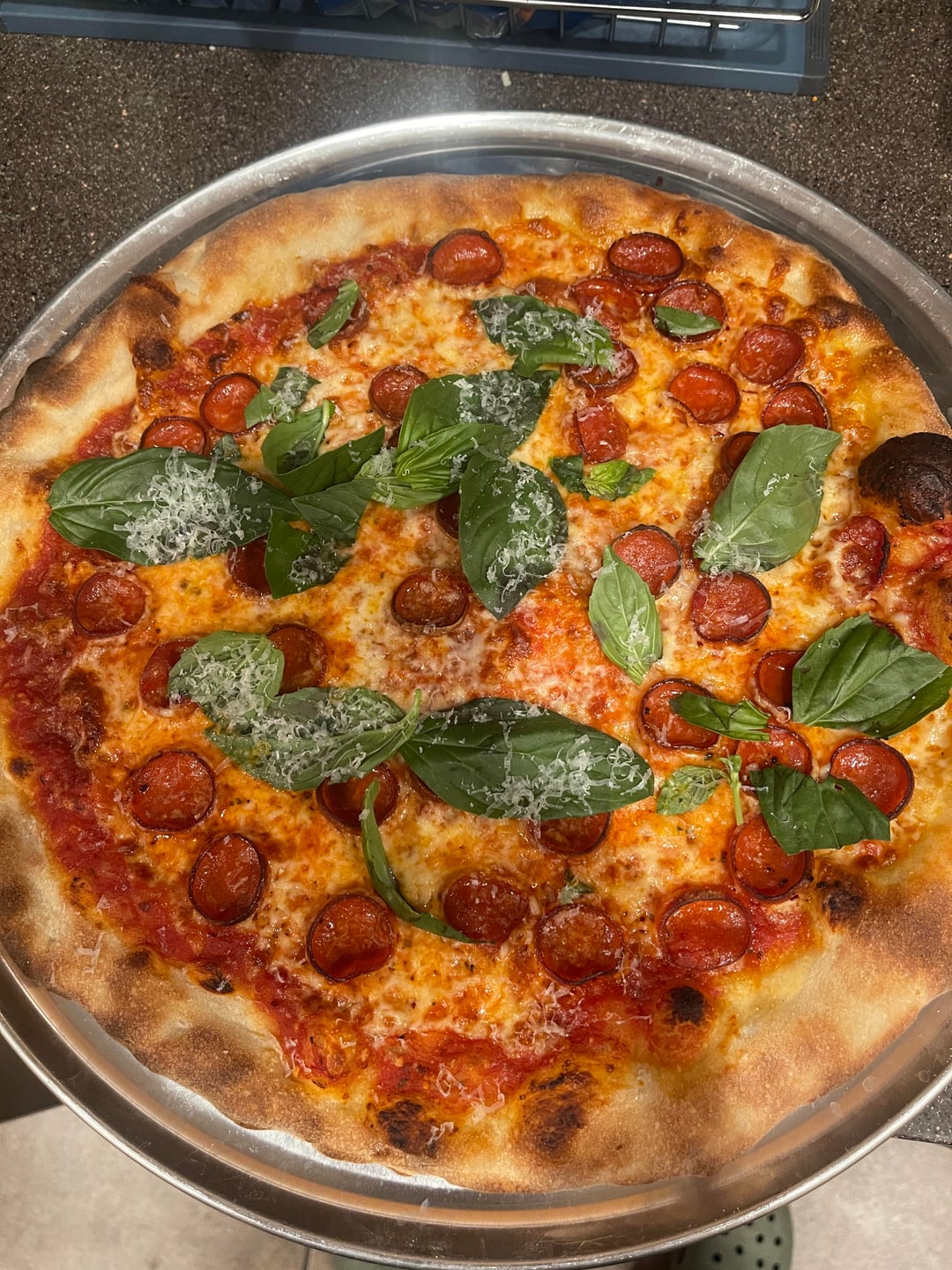 This is a 58% hydration dough that started with a poolish. Tons of flavor…might be my best yet. I used Trader Joe's mozzarella and some house made pepperoni from a local Italian grocery store here in Arizona. This was cooked indoors at 550on a baking steel. I used a mix of bread flours and I'm an also love basil on on my pizza . Enjoy it !!