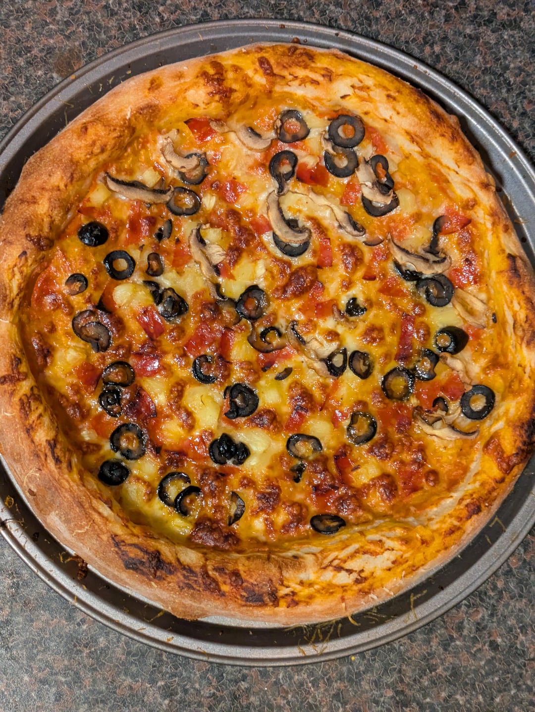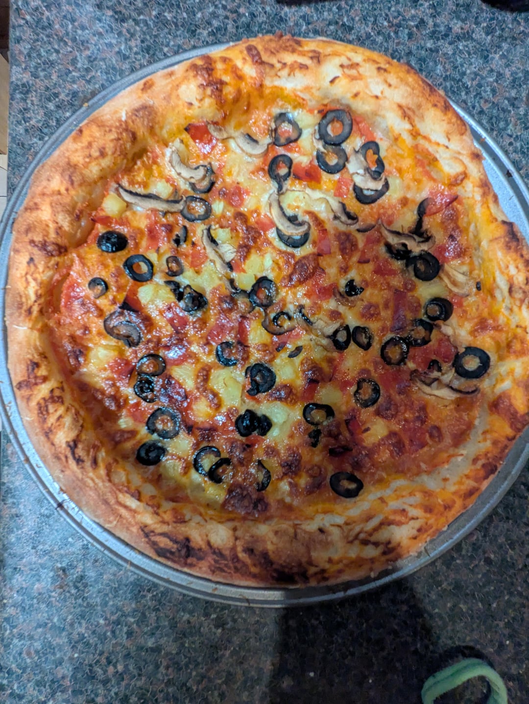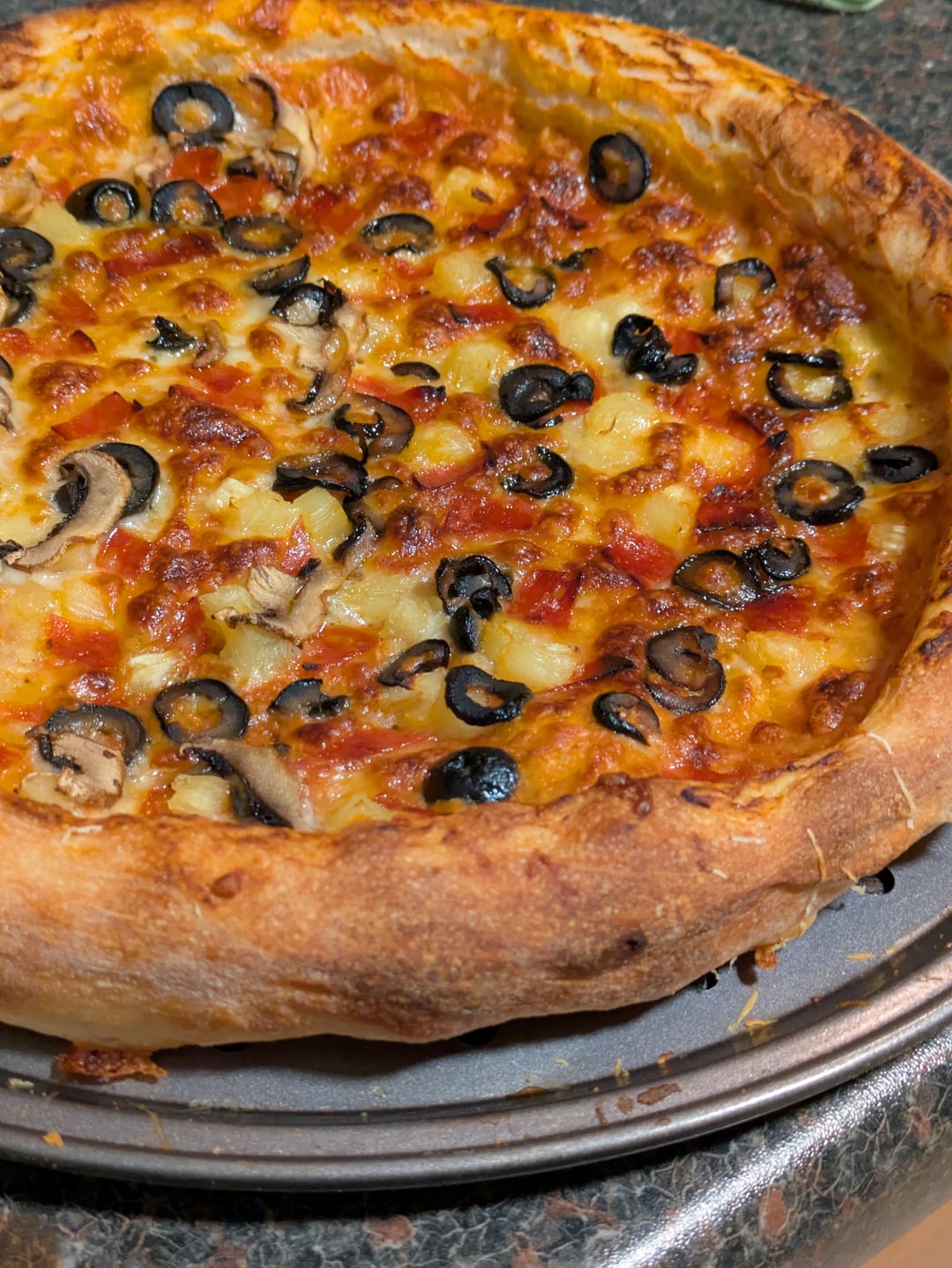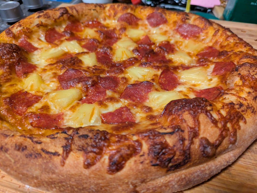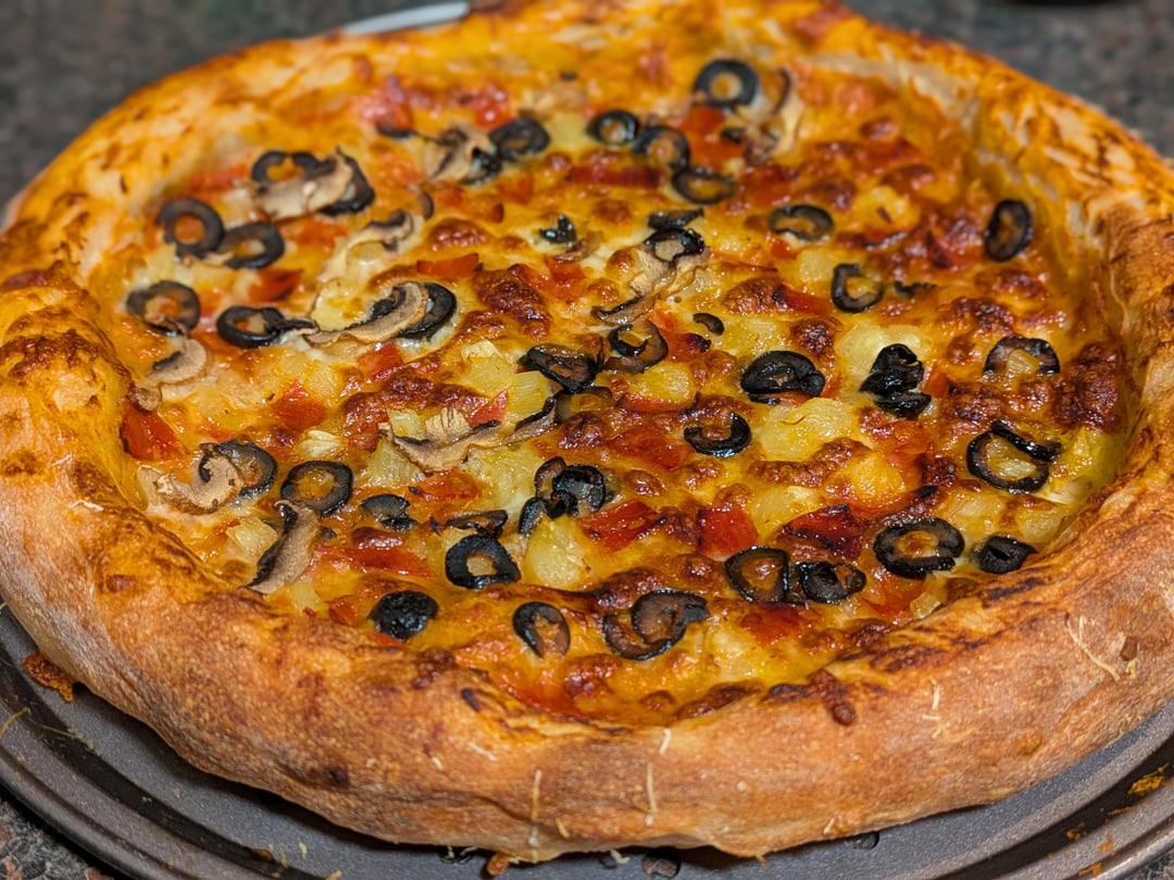 I also only have a regular pan and an oven that goes up to 500 but this looks great. The crust really rose, I’ve been trying to get that. My crusts are more crunchy than bready.