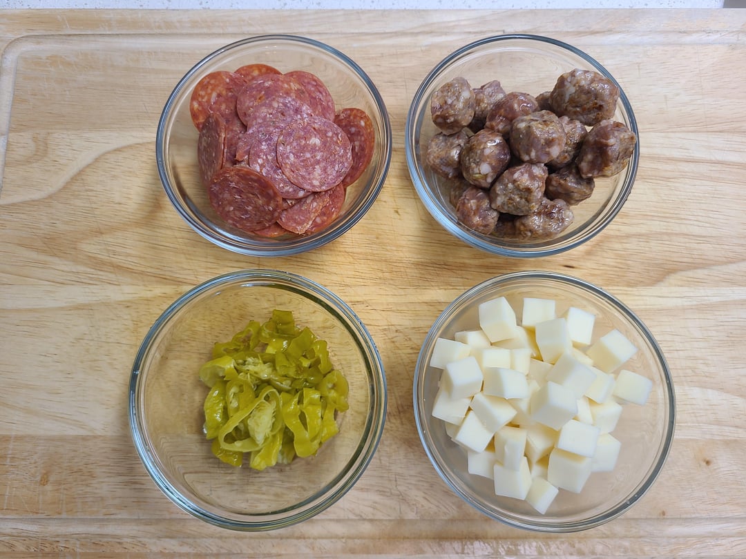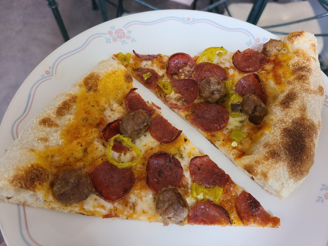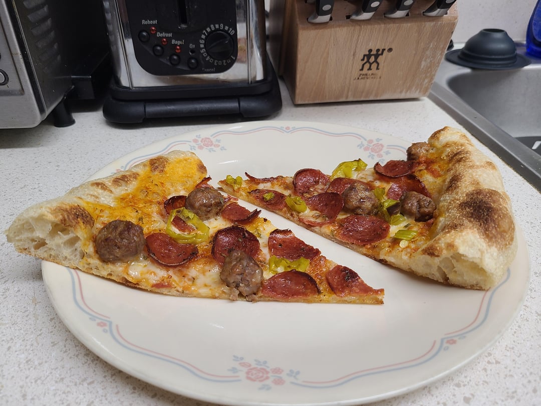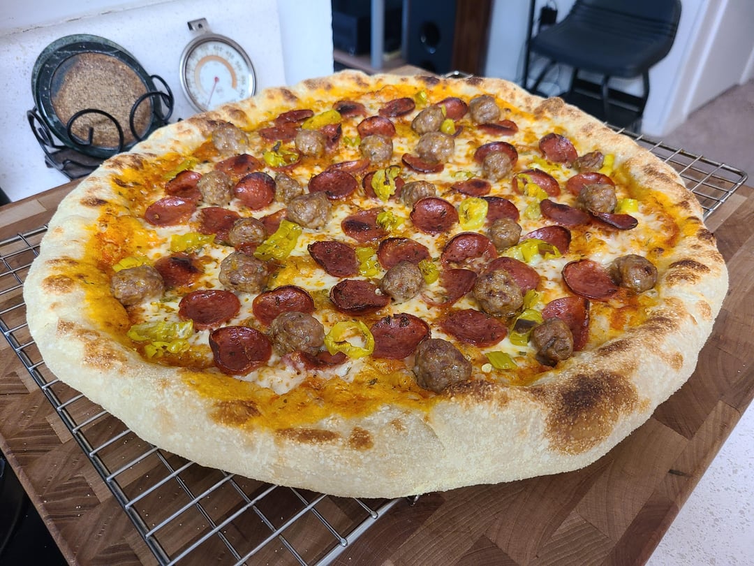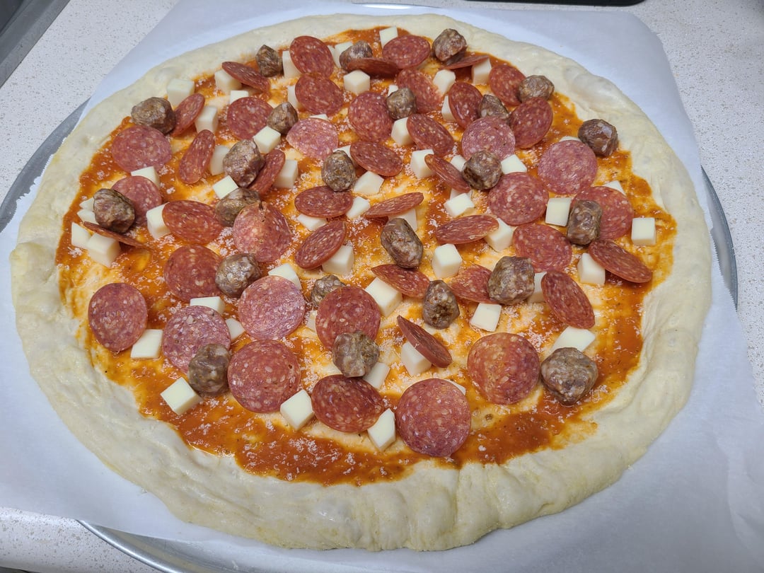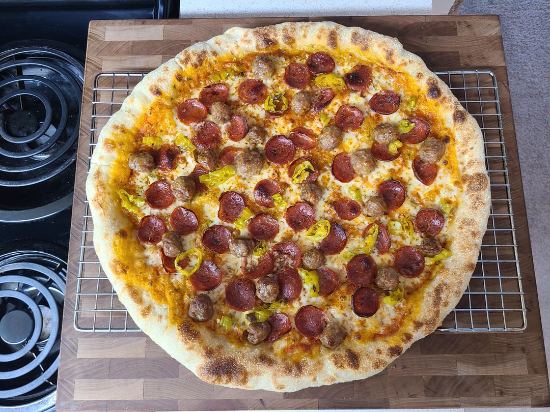 Hand-sliced pepperoni, hot Italian sausage, pepperoncini, (my own) tomato sauce, fresh grated Parmesan and cubed mozzarella!
