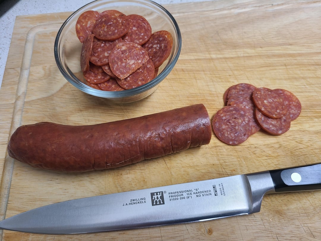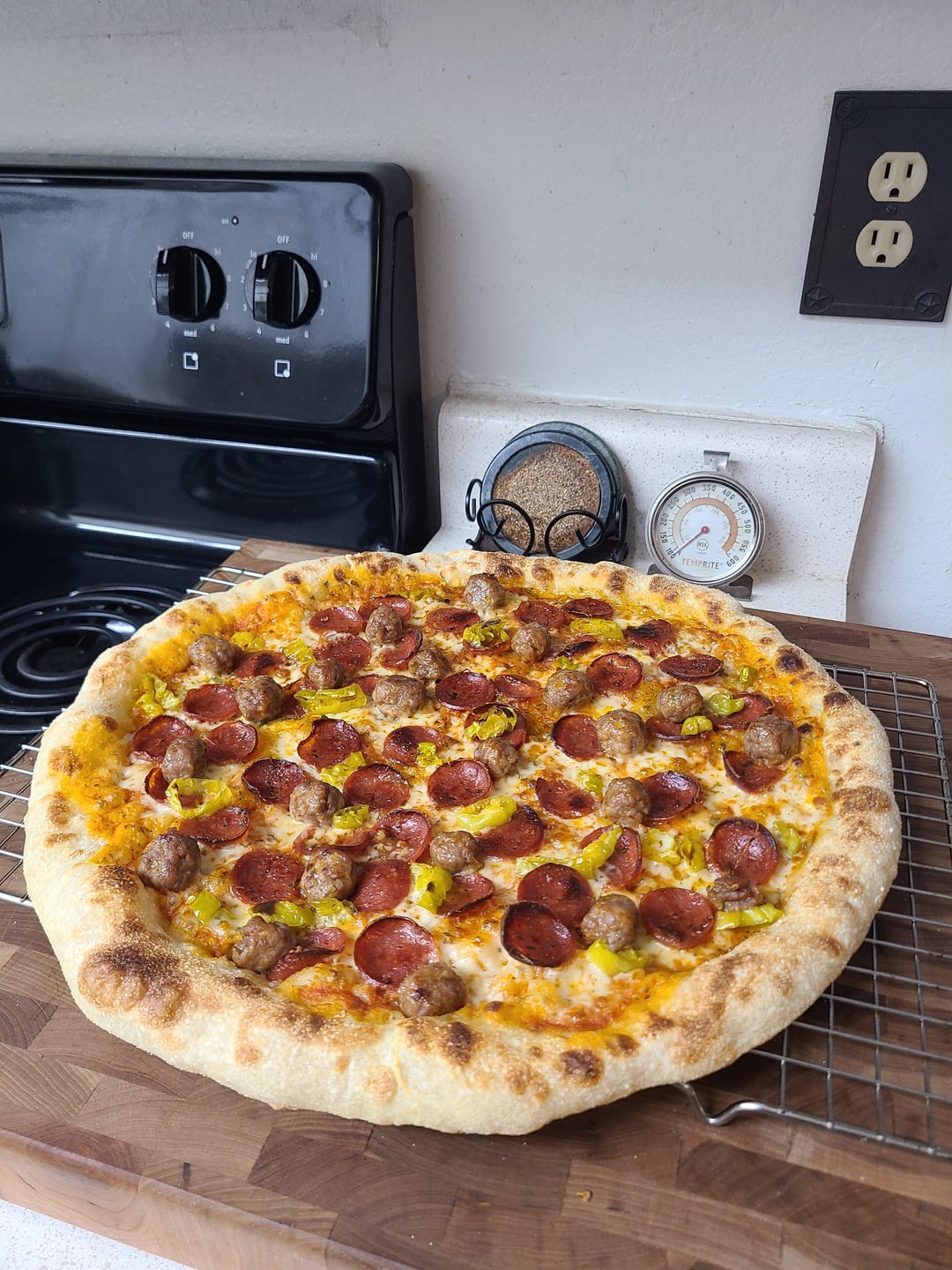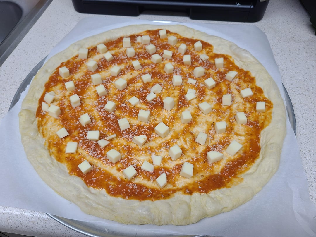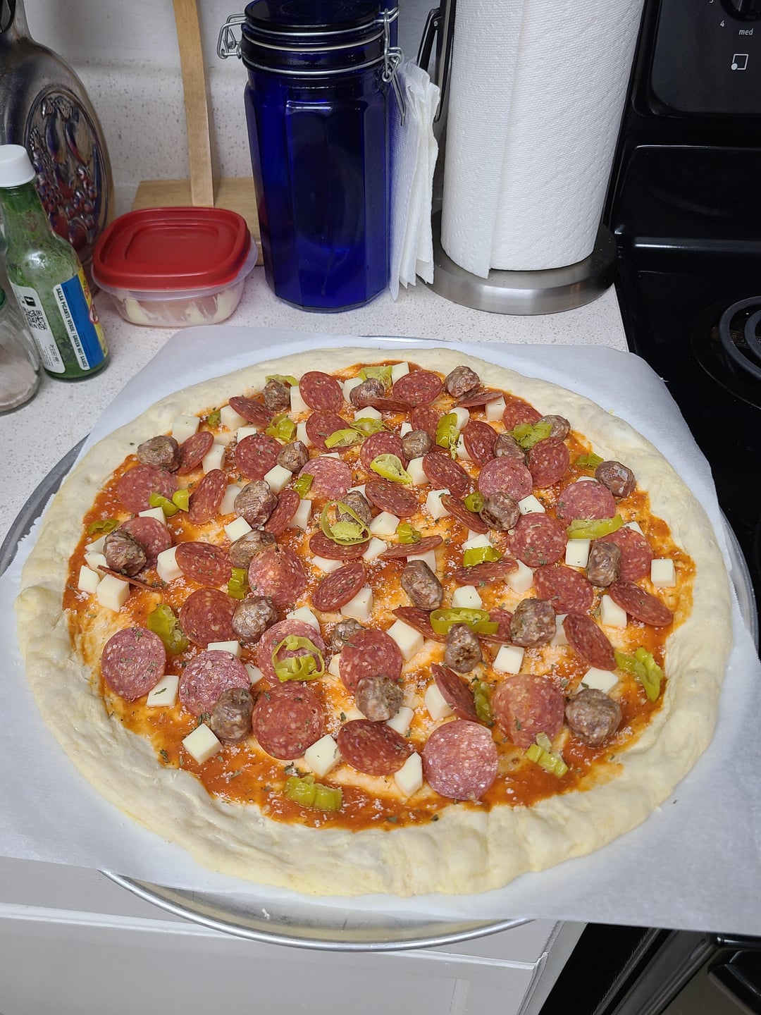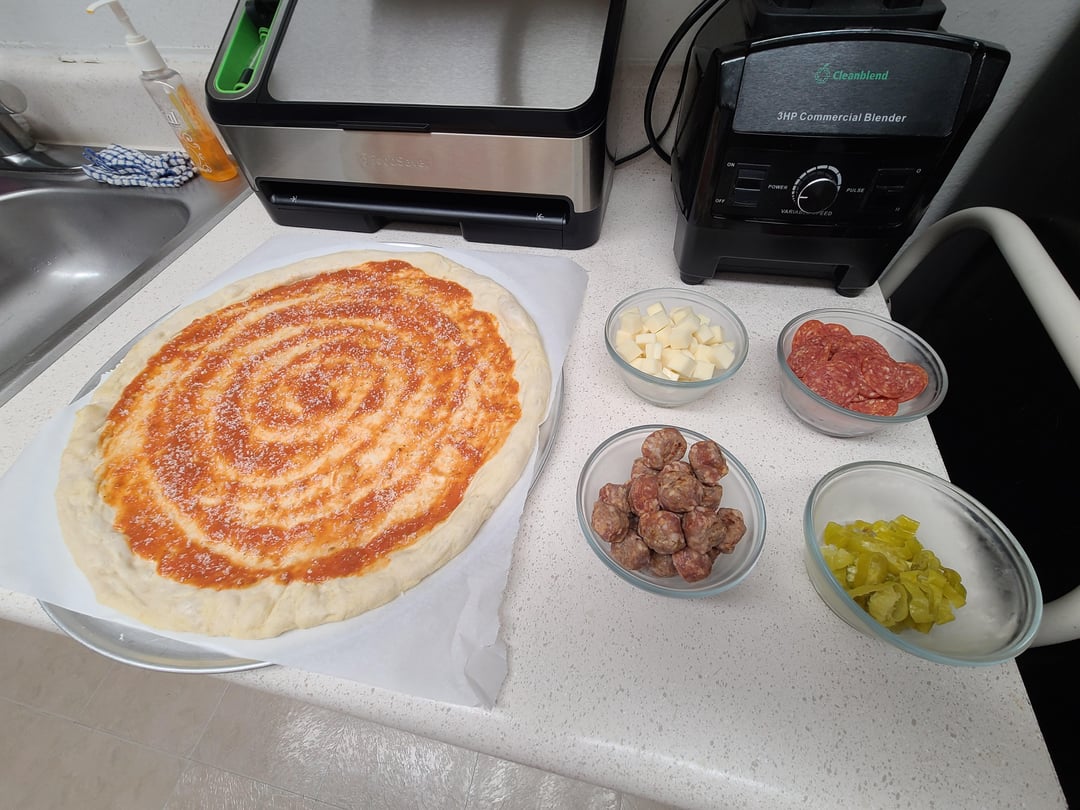 Hand-sliced pepperoni, hot Italian sausage, pepperoncini, (my own) tomato sauce, fresh grated Parmesan and cubed mozzarella!