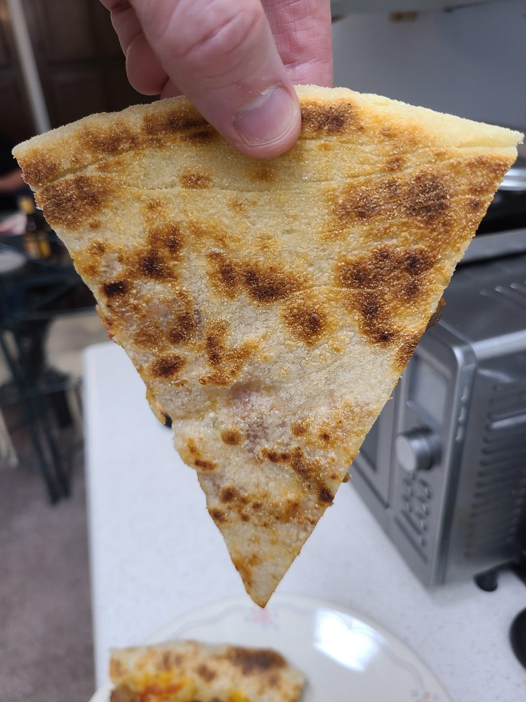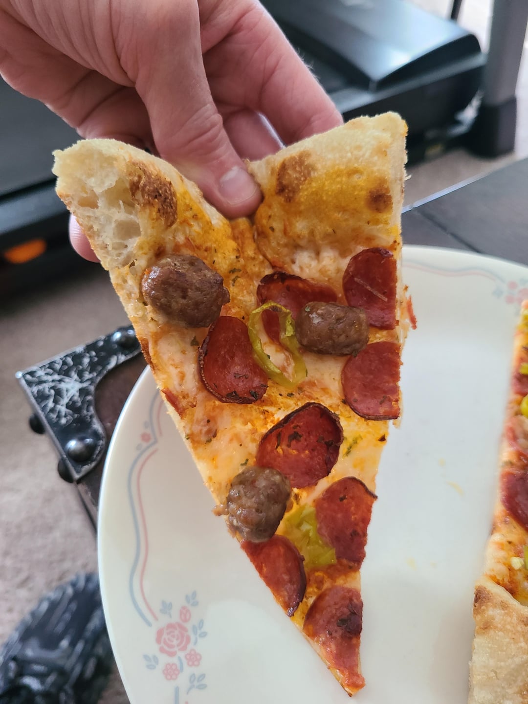 No. There were no leftovers. Had a buddy over and we destroyed it. It was soooo good! The crust was so thin it lifted like a tent. The cornicone was light and airy. Overall, it had a great crunch. The sausage was so juicy!