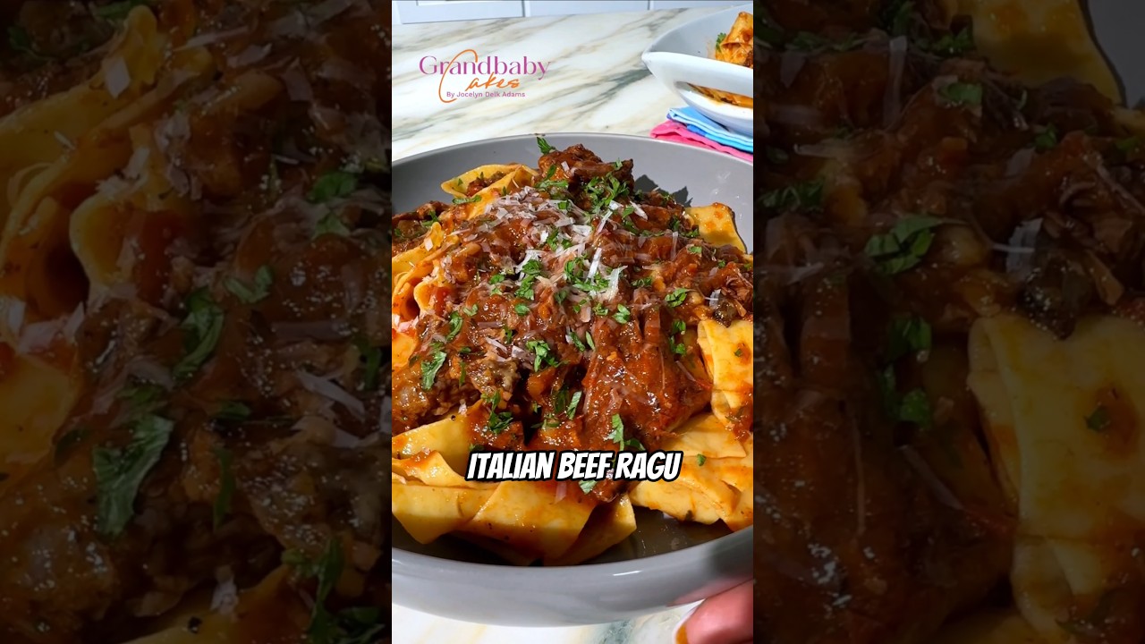 2 pounds short ribs beef shanks or pot roast Kosher salt and black pepper to taste 3 tablespoons extra virgin olive oil 1 1/2 cups chopped yellow onion 2 tablespoons minced garlic 28 ounces crushed tomatoes 1 can 15 ounces tomato sauce 1 can 1/3 cup red wine 1 cup chicken stock 2 tablespoons Italian seasoning and herbs 2 tablespoons granulated sugar 1/2 teaspoon crushed red pepper flakes 1 pound pappardelle pasta cooked chopped parsley and parmesan cheese for garnish