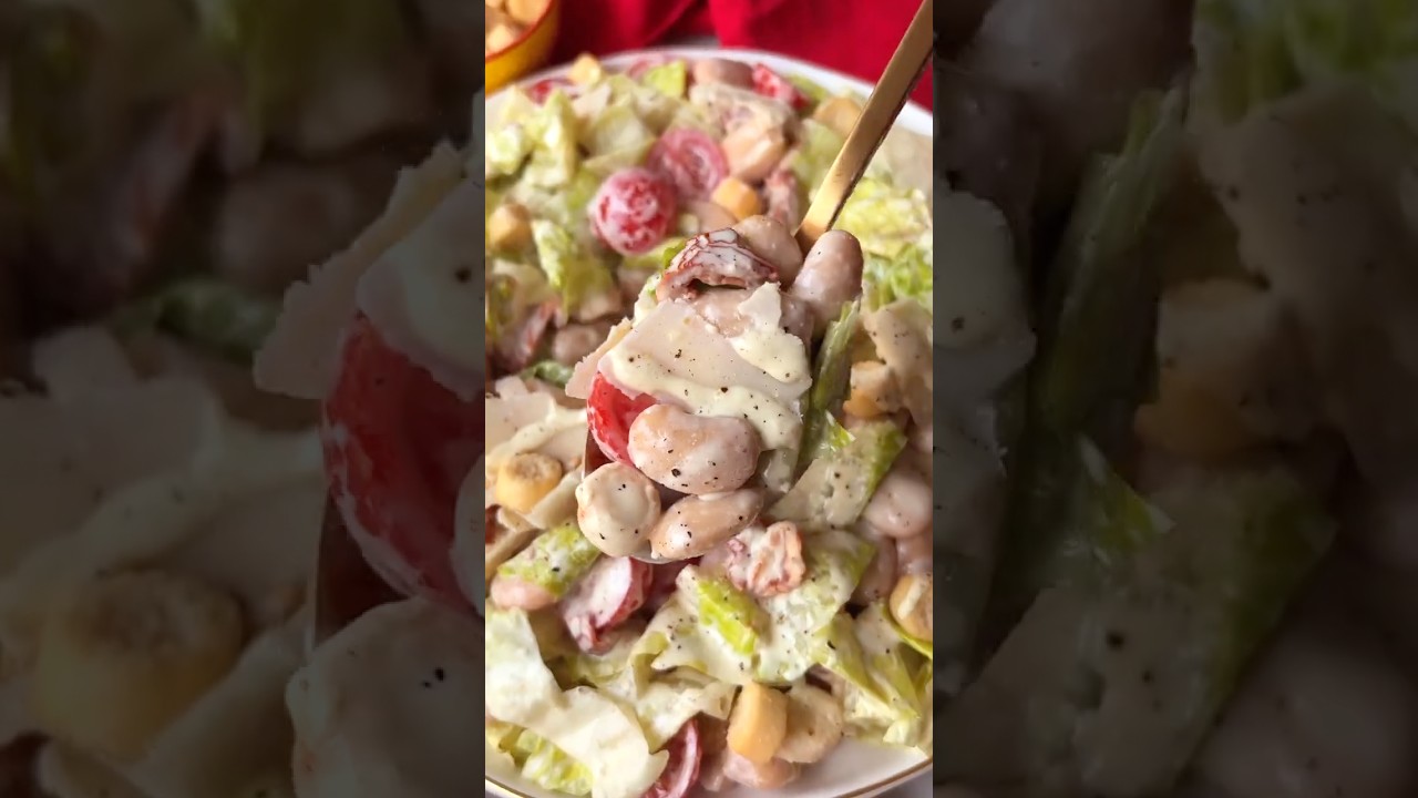 Tender butter beans, crisp romaine, juicy tomatoes, and crunchy croutons are tossed in a rich Caesar-style dressing made with Greek yogurt, mayo, Parmesan, and capers. It’s bold, fresh, and ready in about 10 minutes — perfect for an easy lunch or light dinner.