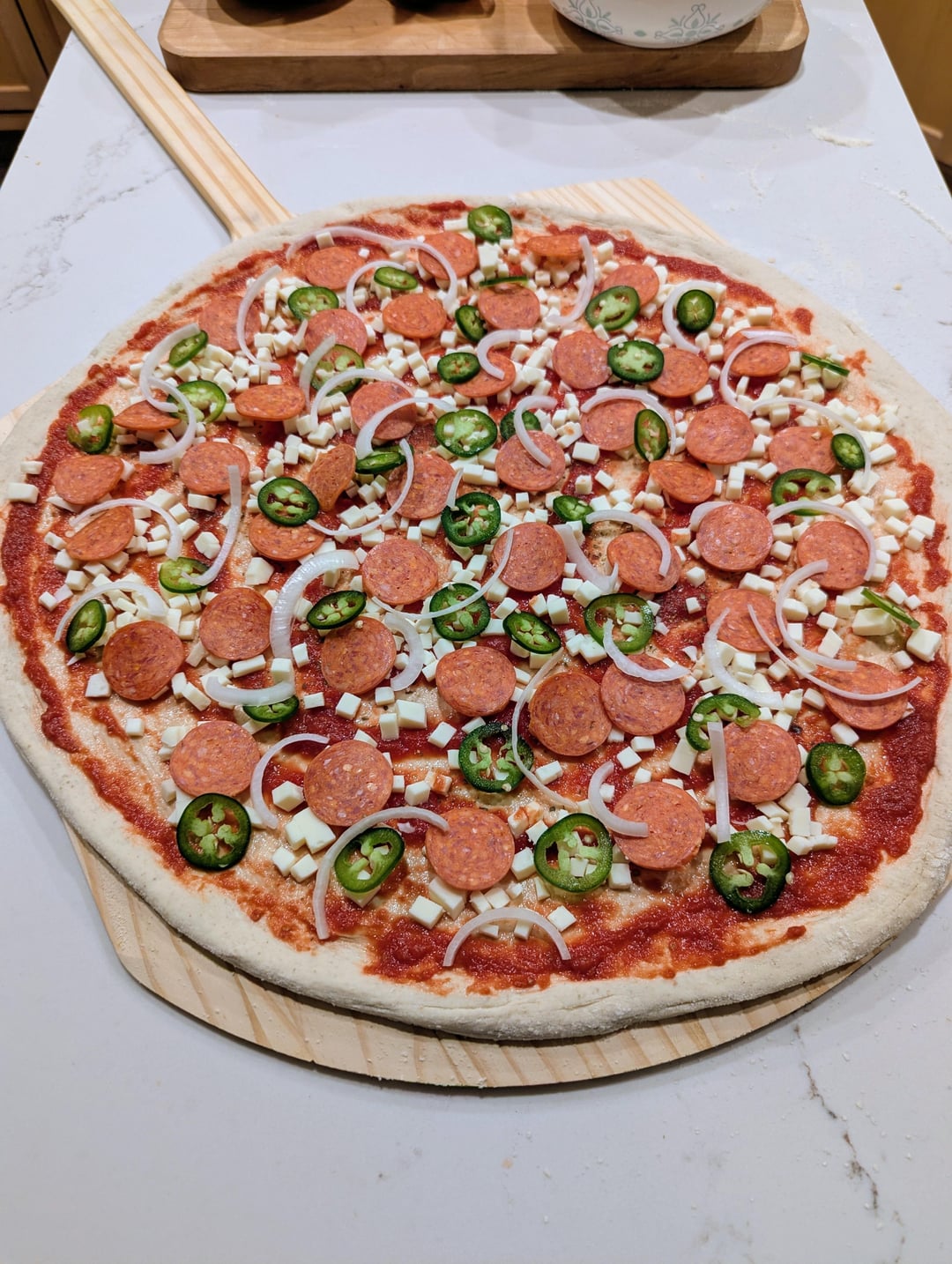 A really good pizza to start the weekend off right! 62% hydration, 20" NY pizza with cup and char pepperoni, jalapeno, and onion. I don't know what I did differently but the crust tasted extra crispy and light while still being strong enough. Dough being dough I suppose.