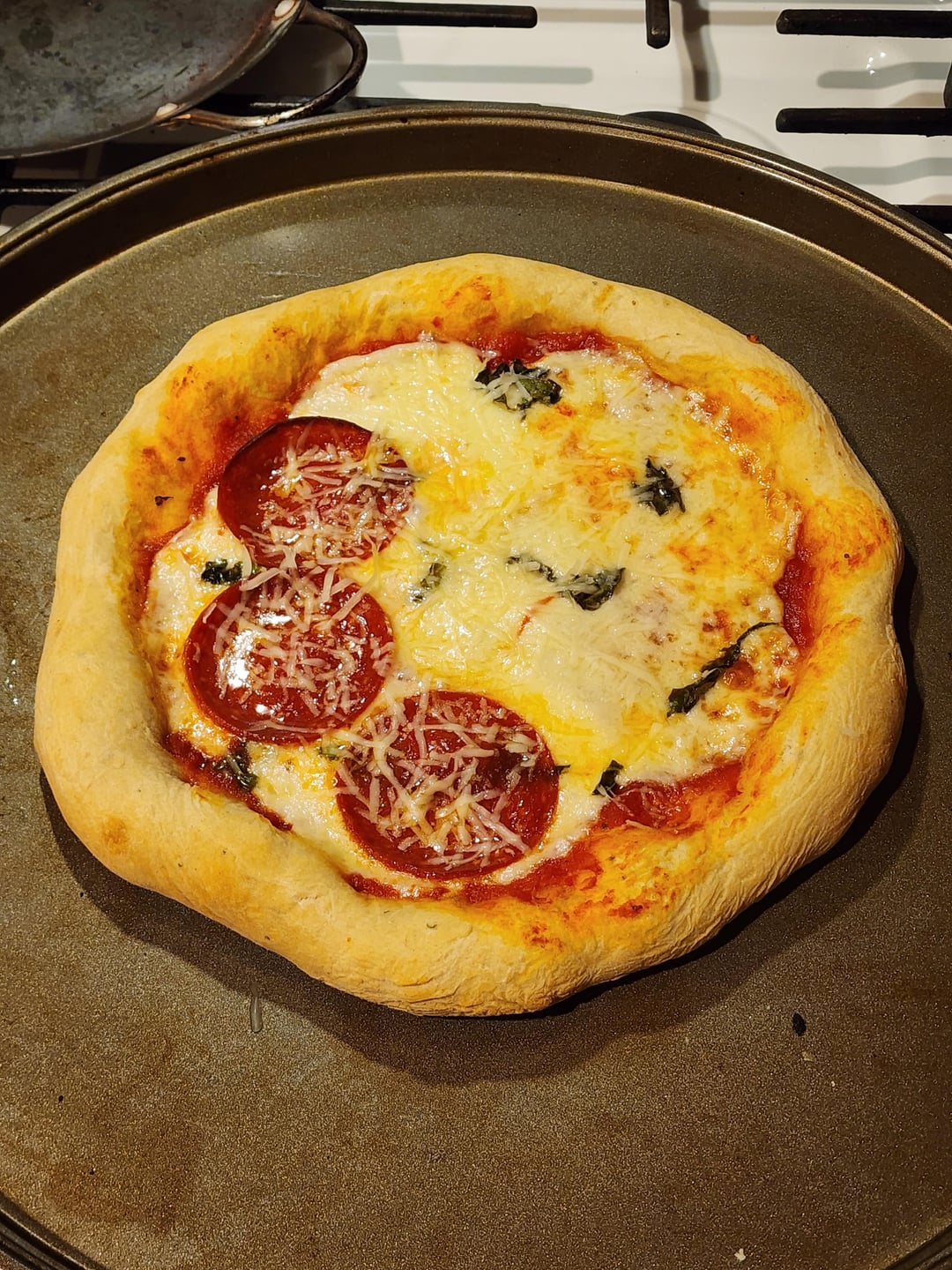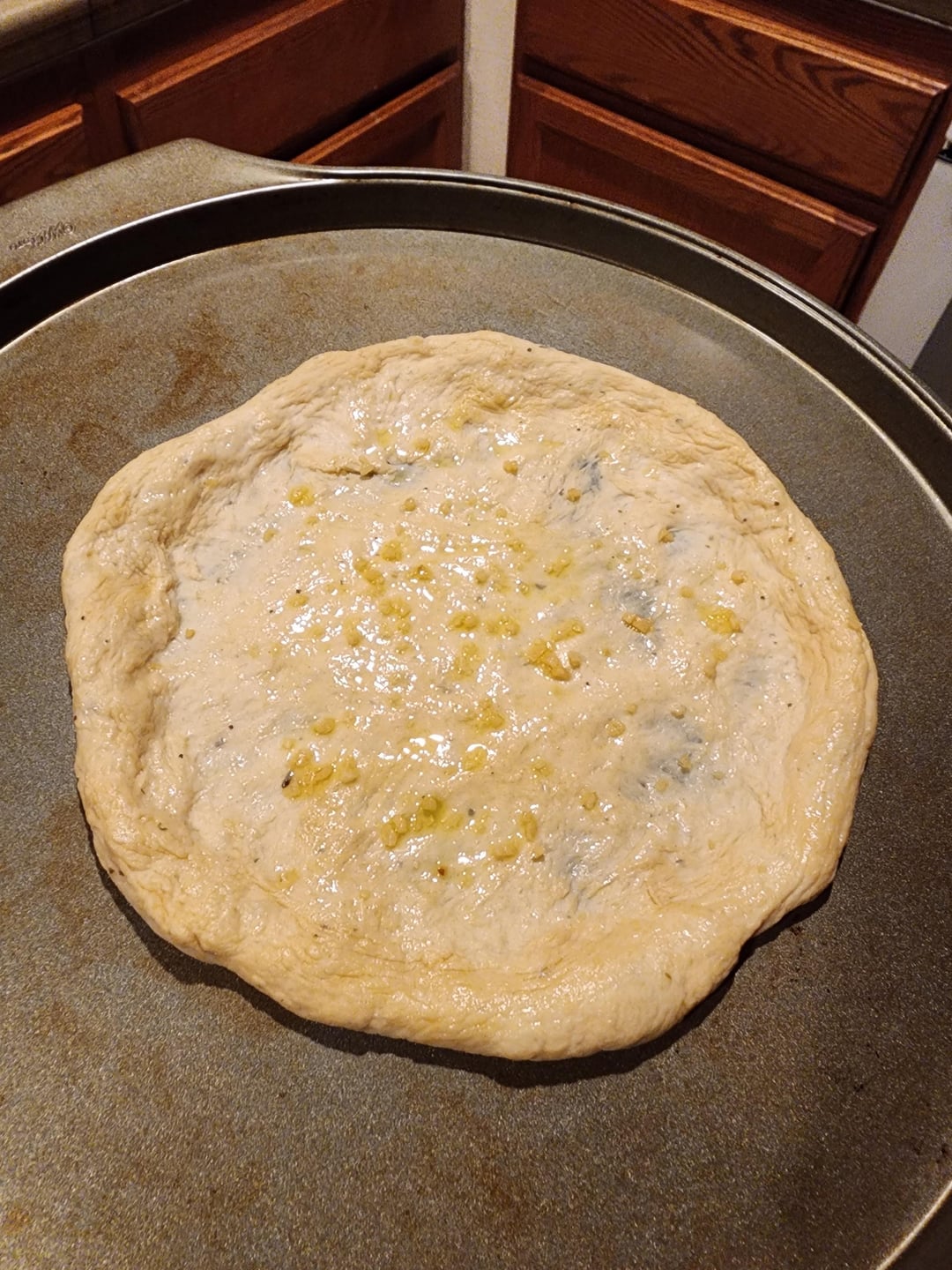For the crust I went with 50/50 King Arthur ap and 00 flour 2 cups and 3 tbsp of each with a tsp of salt, 1/4 tsp garlic a pinch of dried basil, 1 cup of water, 1 tsp of active dry yeast, 1 tsp sugar, for a 48 hour fridge fermentation.