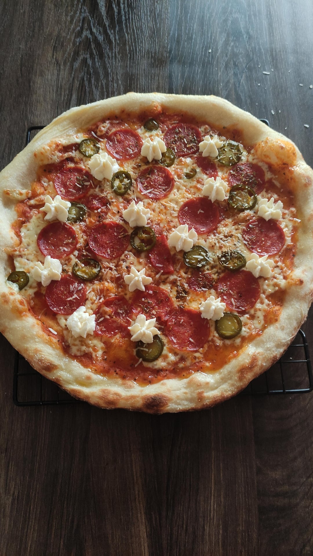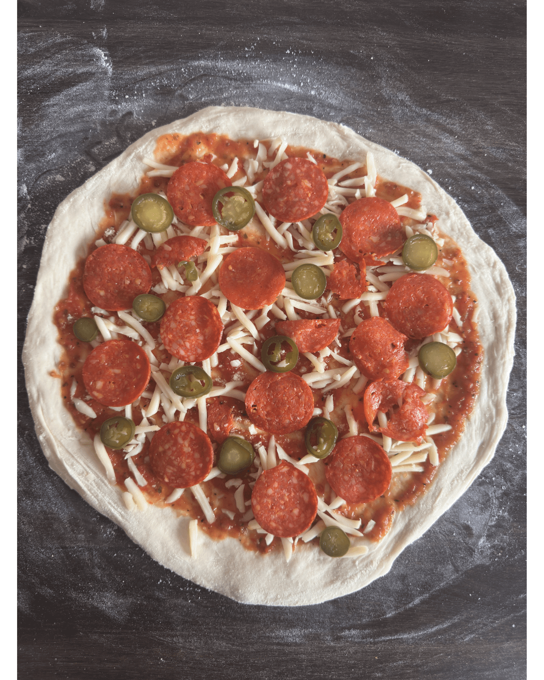 Used 00 flour, Parmesan, Low mos Mozz, Pepperoni, Jalapeno, EVOO, Pecorino & Ricotta