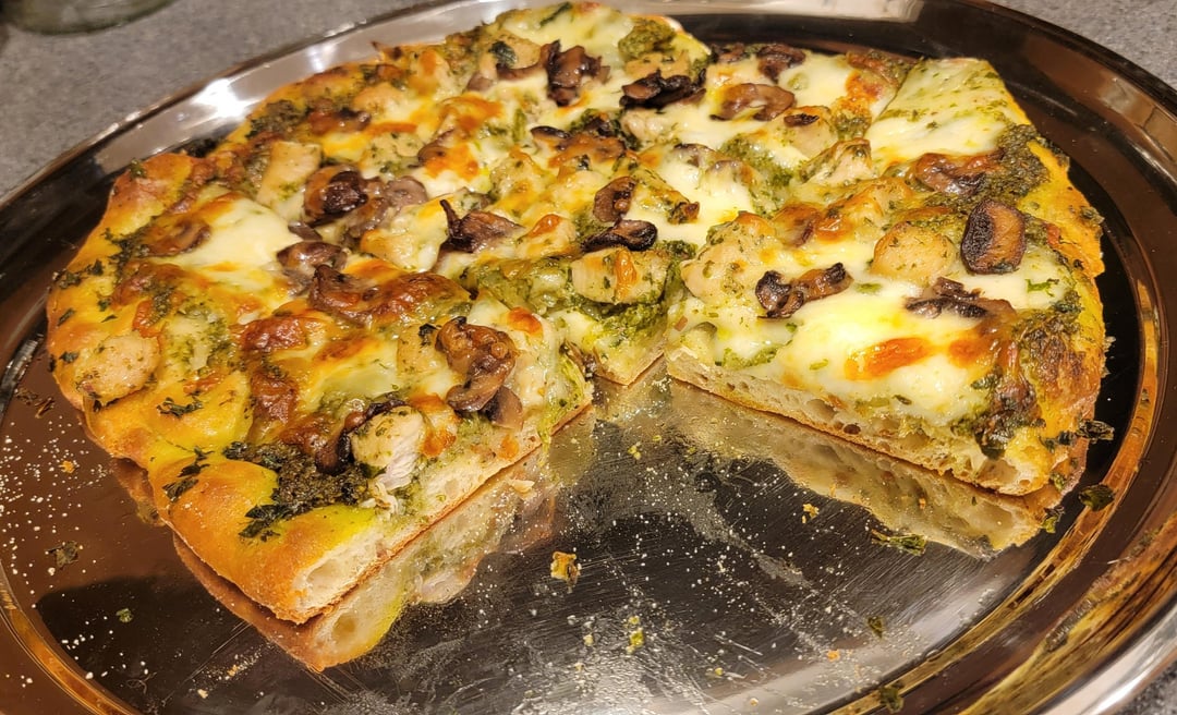 Pistachio and pine nut pesto, sautéed mushrooms and Amish chicken, sliced fresh mozzarella, plus shredded Amish mozzarella. Brush of olive oil and sprinkled basil on the crust. Made on an indoor oven pizza stone.
