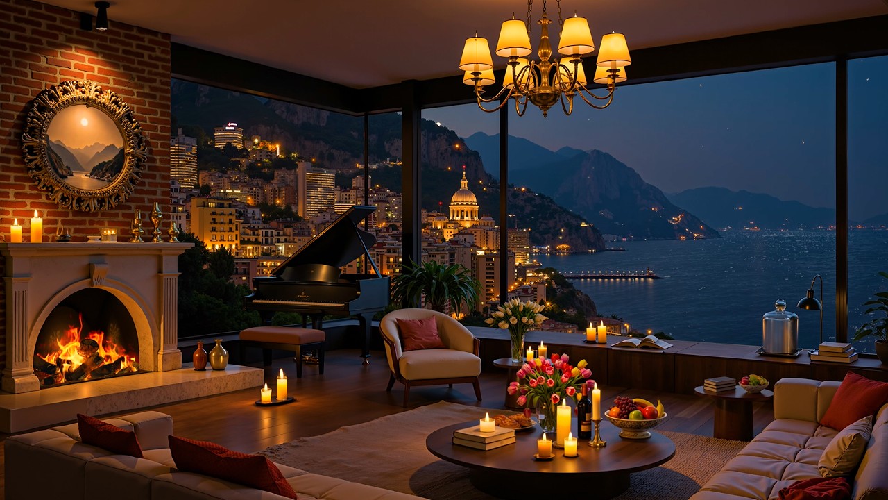✨ A beautiful coastal apartment overlooks the glowing hillside town of Positano on a calm Mediterranean night. Through the large glass windows, golden lights from colorful buildings cascade down the cliffs toward the dark blue sea, while a softly illuminated church dome rises above the town. Inside, the elegant living room glows with candlelight and the warm flames of a classic fireplace. A grand piano sits near the window, ready to fill the room with music as the sea breeze drifts through the night. Comfortable sofas surround a round coffee table decorated with flowers, fruit, wine, and books. Smooth jazz saxophone plays gently in the background, blending with the peaceful coastal atmosphere to create a relaxing Italian night ambience perfect for unwinding after a long day.