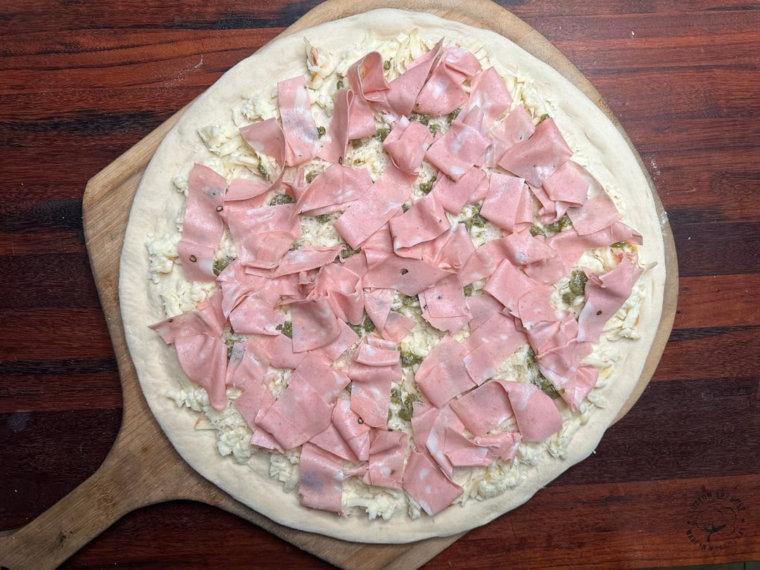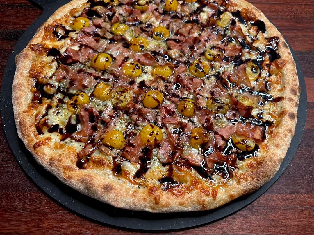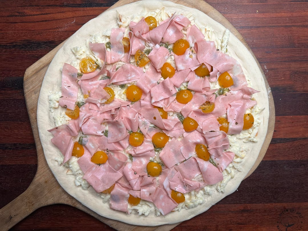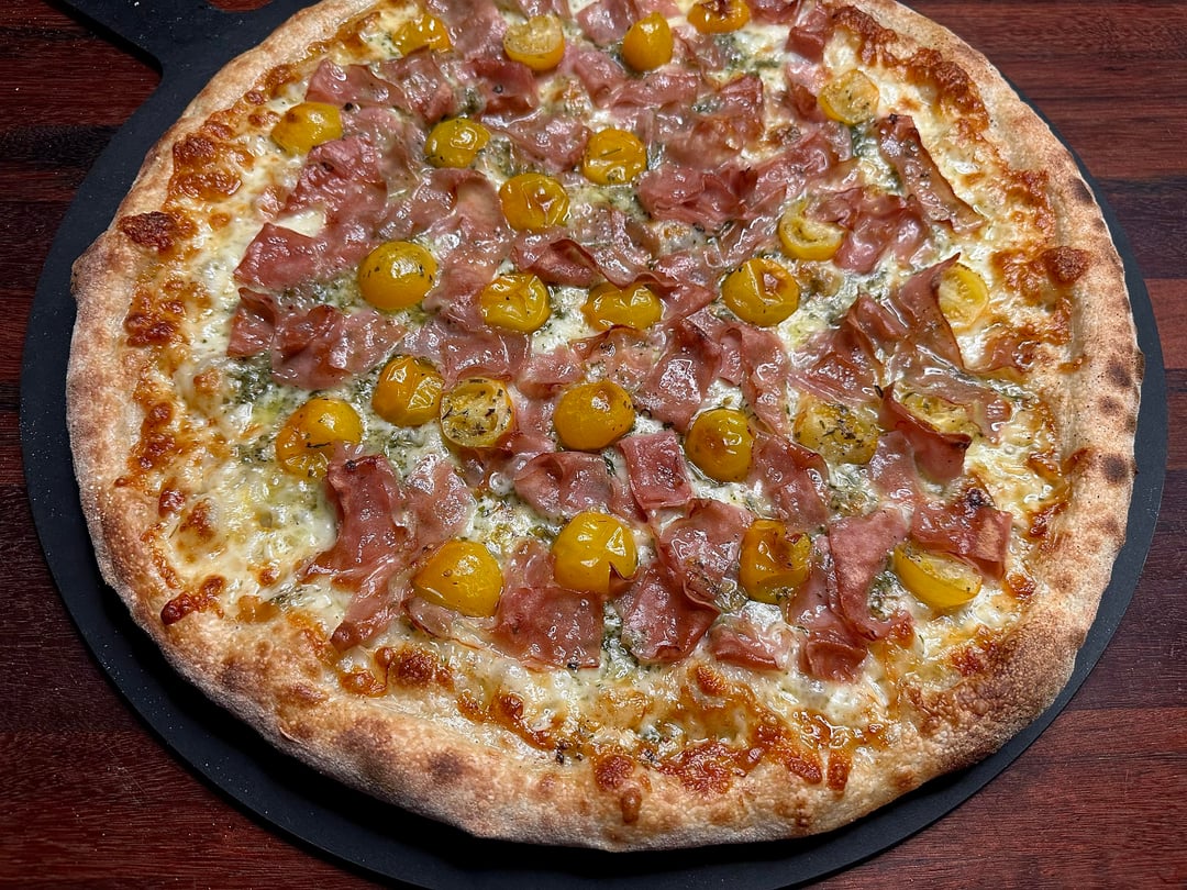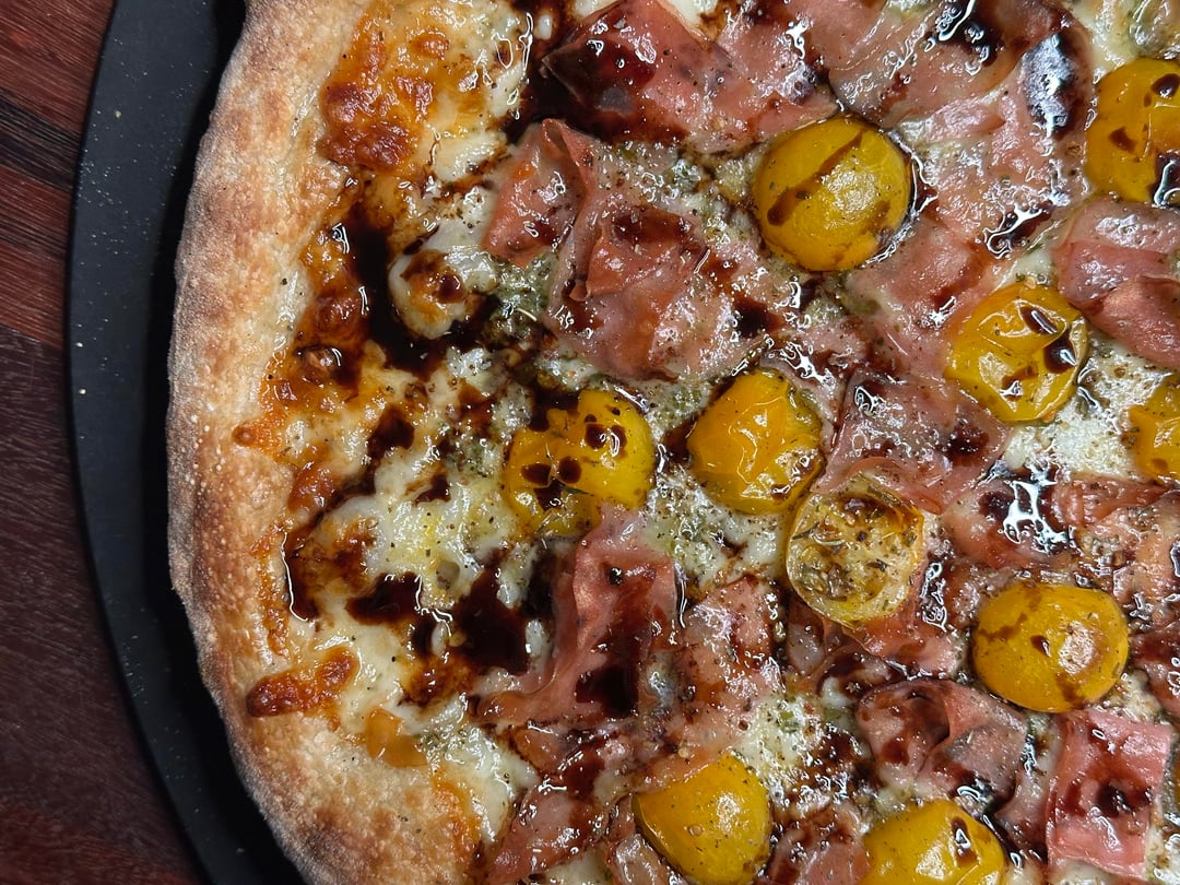 Finally pizza night again! This week’s special had my three cheese mix (mozzarella, provolone, and smoked Scamorza), pesto, strips of mortadella, grated Pecorino Romano, and some quick marinated yellow cherry tomatoes. Out of the oven I finished it with some balsamic reduction.