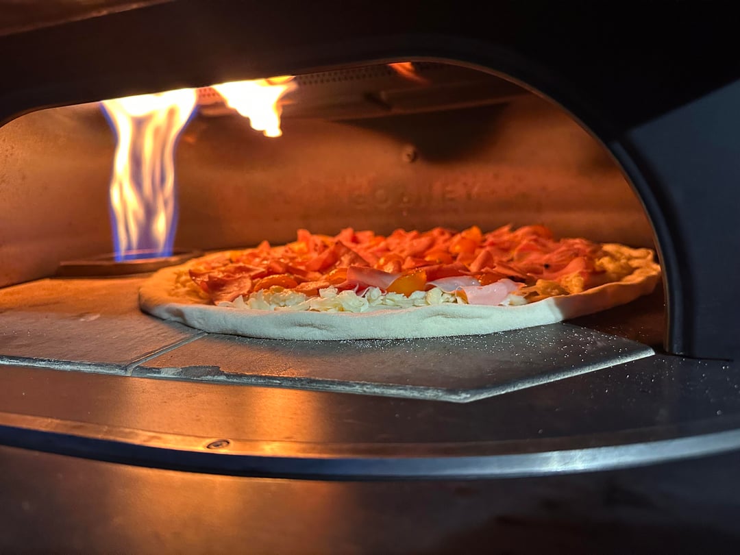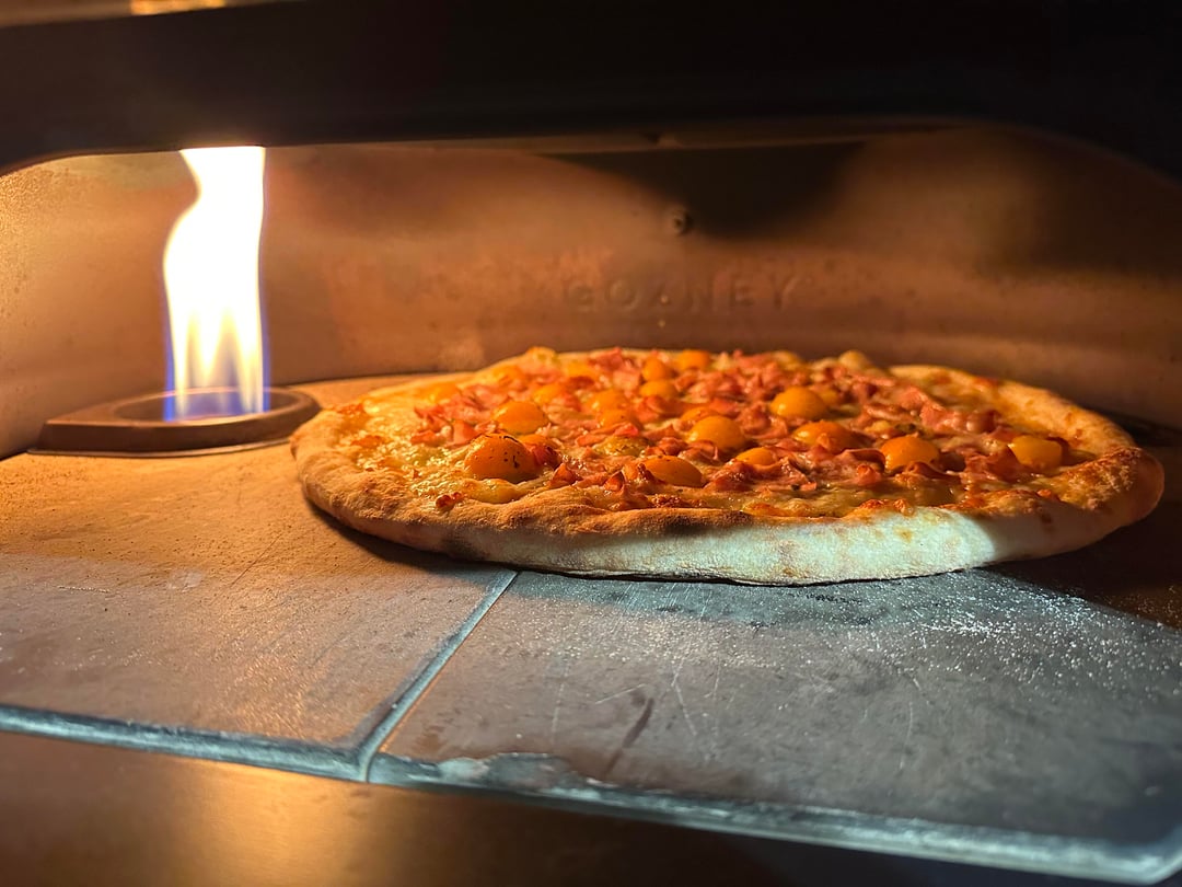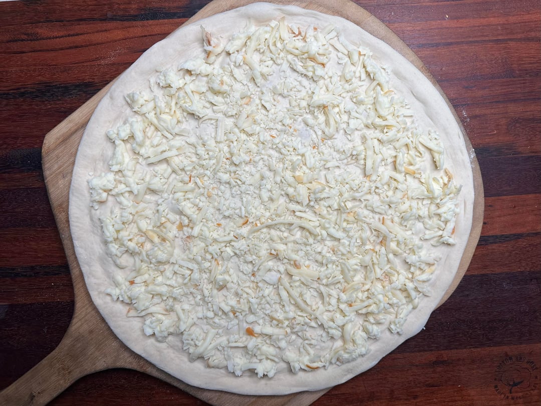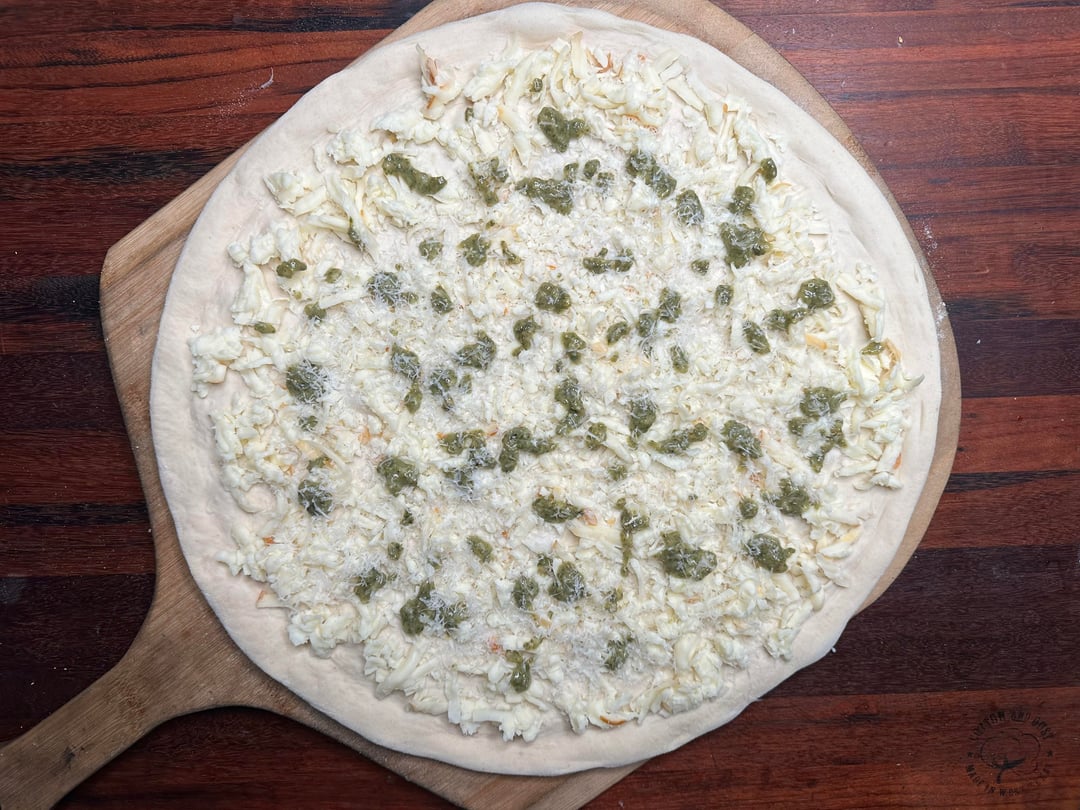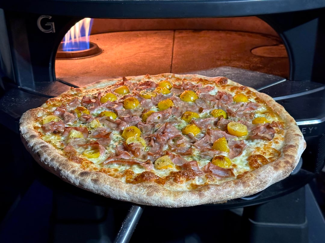 Finally pizza night again! This week’s special had my three cheese mix (mozzarella, provolone, and smoked Scamorza), pesto, strips of mortadella, grated Pecorino Romano, and some quick marinated yellow cherry tomatoes. Out of the oven I finished it with some balsamic reduction.