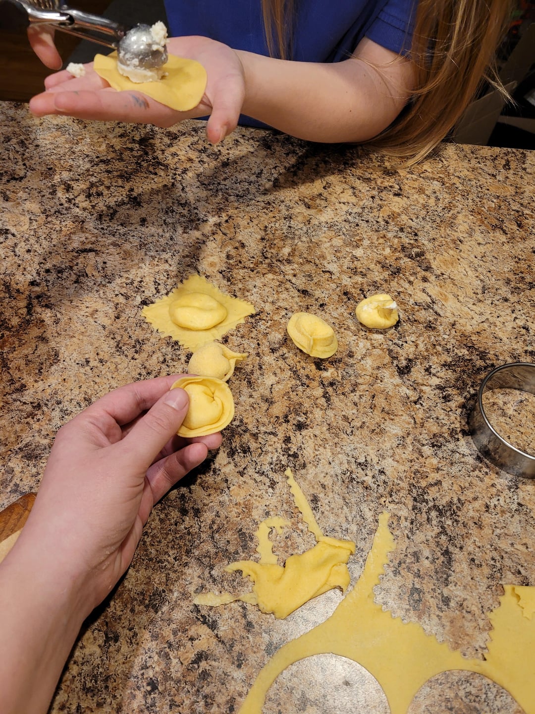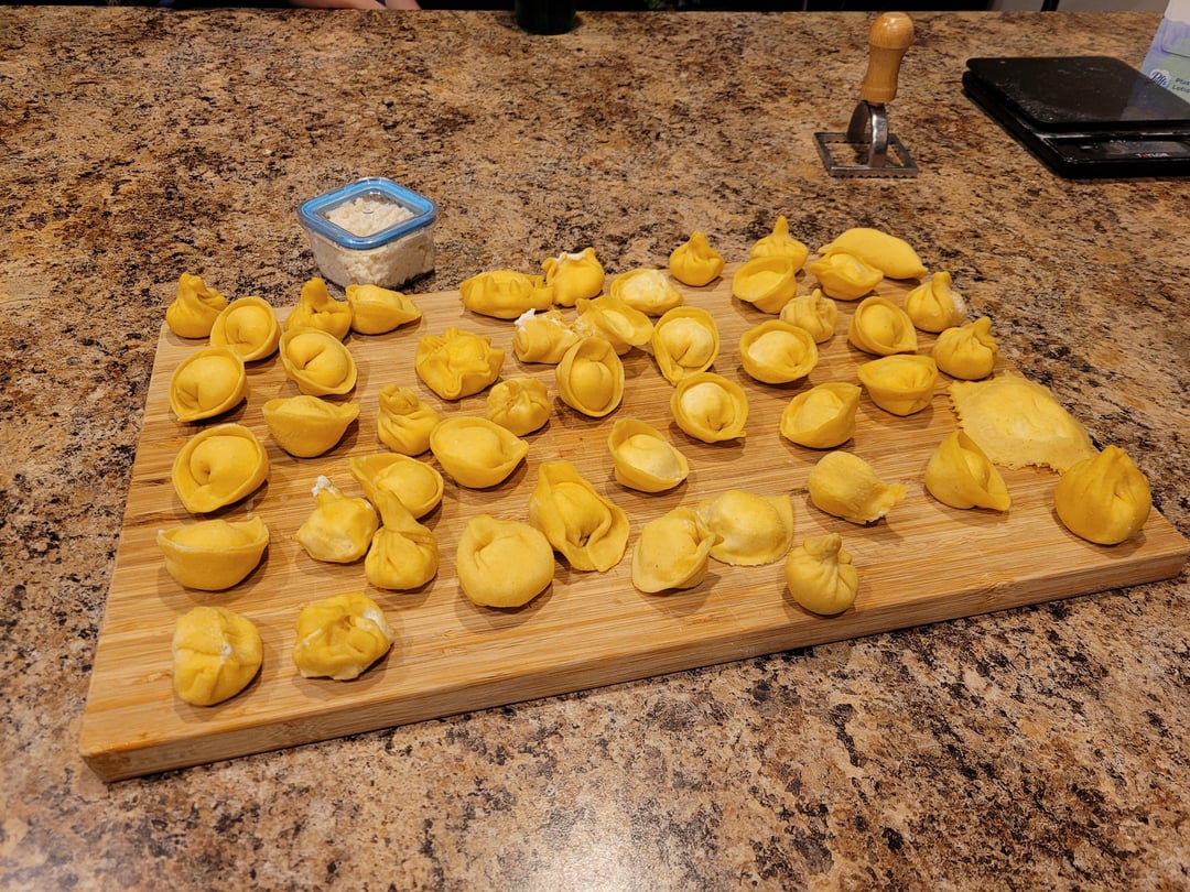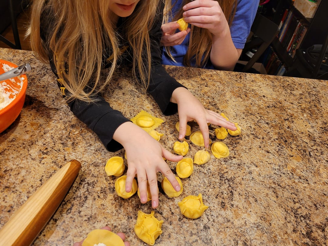 I was craving tortillini the other day and didn't have any, but I did have semolina in the house, so I took some time to teach my kids about handmade pasta. We taste tested the filling, my daughter noticed they were basically mini dumplings, and we all got a chance to try our hand at shaping them. Admittedly I was very traditional while they got creative, but it was a lot of fun!