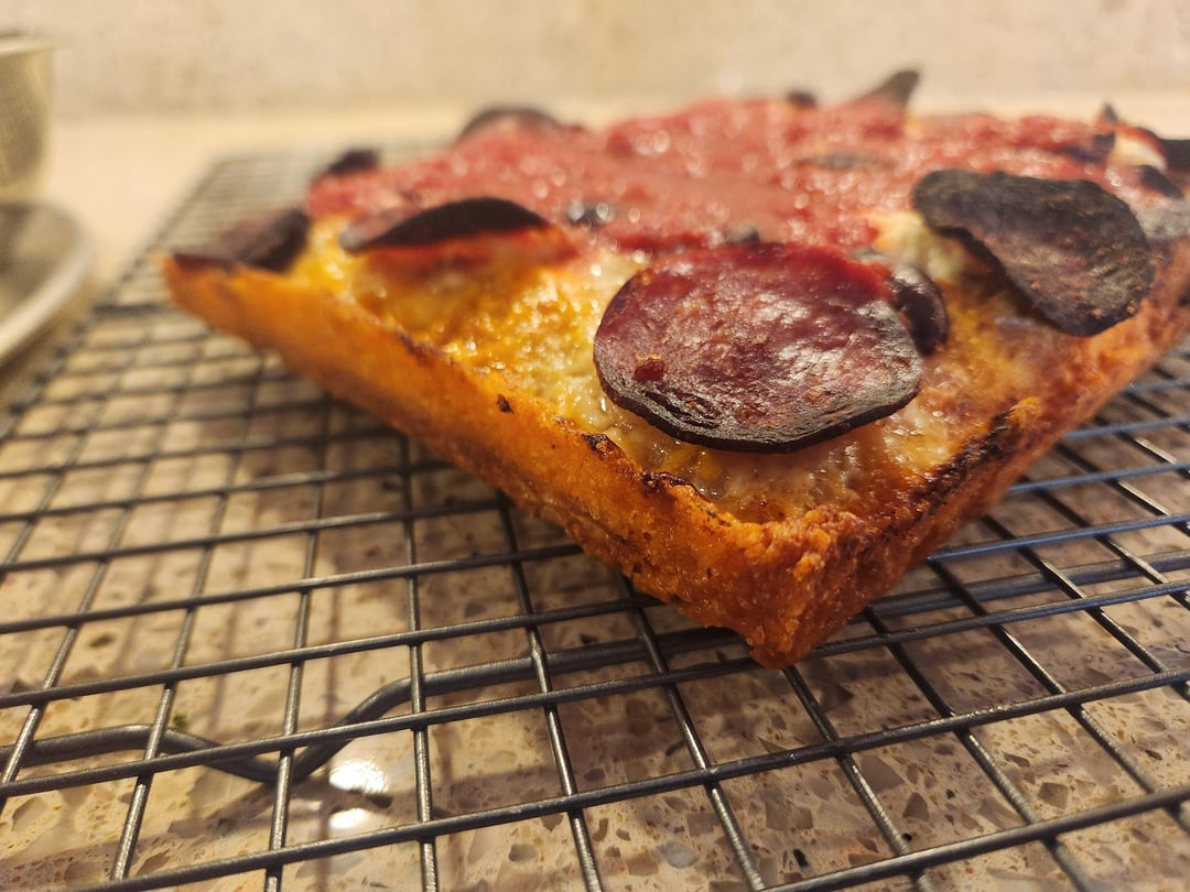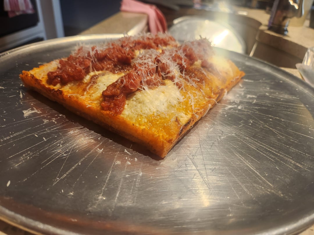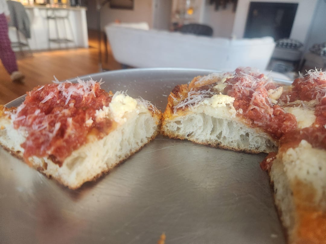 I've been making pizza for about 6 months. I recently got an 8×10 blue steel pan and made up some deteoit dough. The first two are my first pie with a same day ferment. The next three are after 48 hour cold ferment and 6 hours at room temp in the pan. The last two are 72 jour cold and 6 hours in the pan.