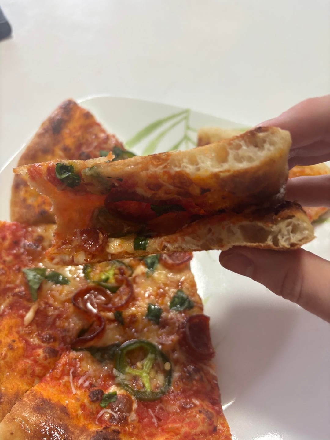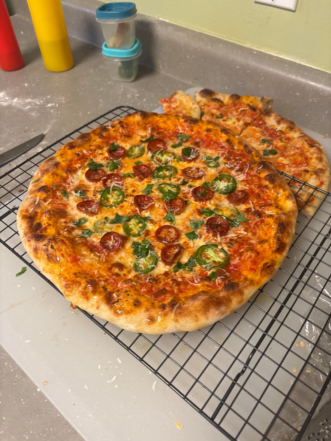 Pepperoni & jalapeño with same dough, pecorino al pepperoncini, same cheese blend, basil, parm, and homemade, actually HOT honey made with habanero. Coulda definitely done with some more pep but still a win.