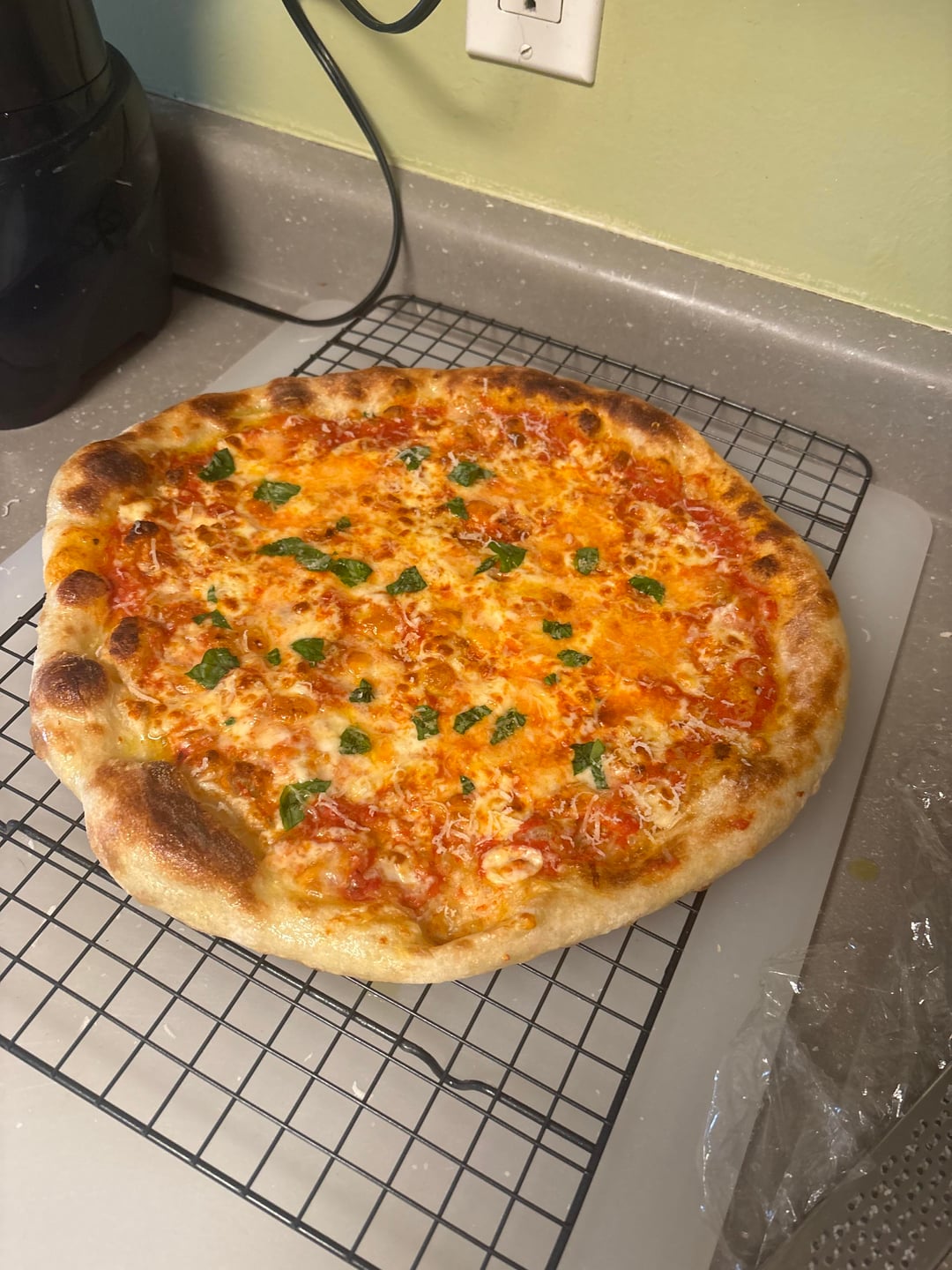Classic plain, 72 hour cold ferment, davespizzaoven recipe, tomato sauce, pecorino romano, light mozzarella and scamorza blend, garnished with basil and parm reg.
