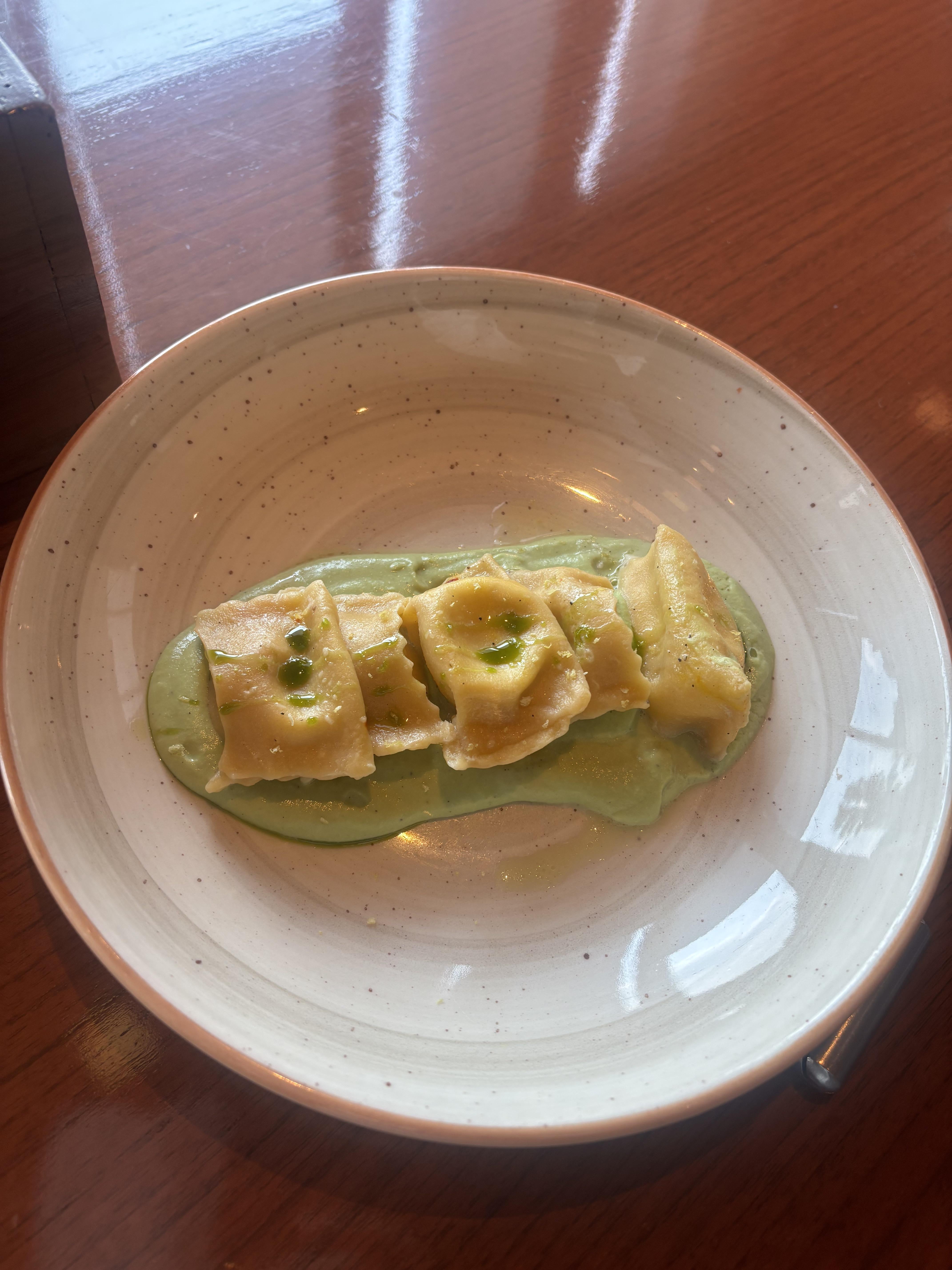 The cream is made out of seasonal green peas which is sweet and cuts down the sharp flavour of the pecorino. The citrus zest adds in the freshness to the dish.
