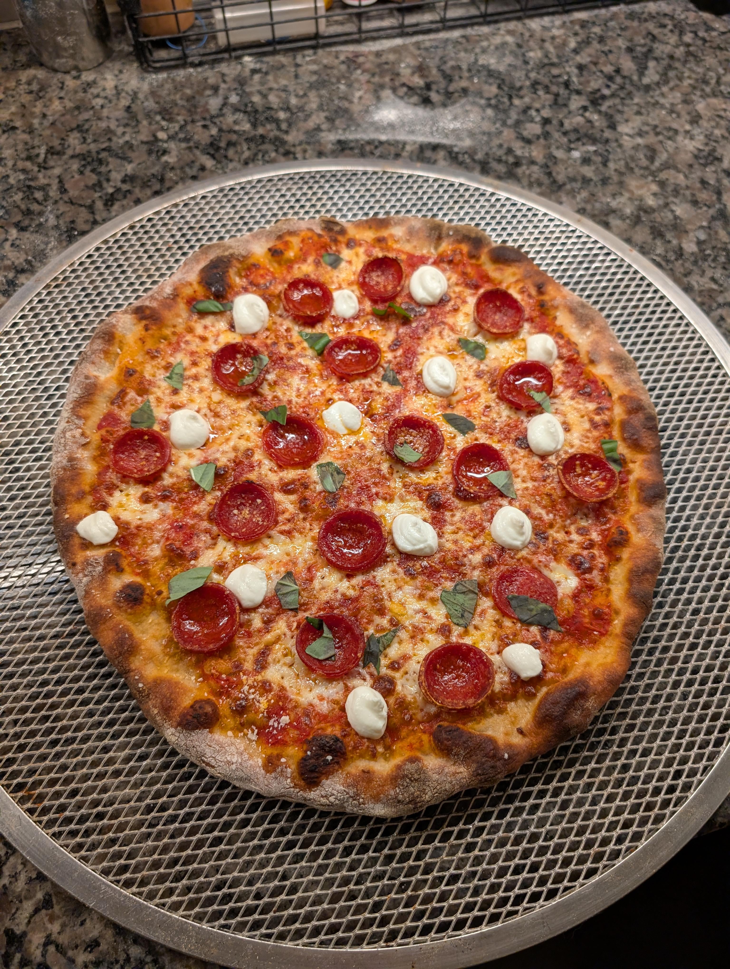 Charlie Anderson dough recipe with pep, basil, whipped ricotta. 525F oven (no convection), temp laser checked the baking steel at 575F. Par bake with no cheese for 2 mins then all topins for another 3 mins, then under broiler for 3 mins. Slightly too crispy but overall very good. Tried to bake with a a loaf tin with water to increase blistering but no avail. Cheers!